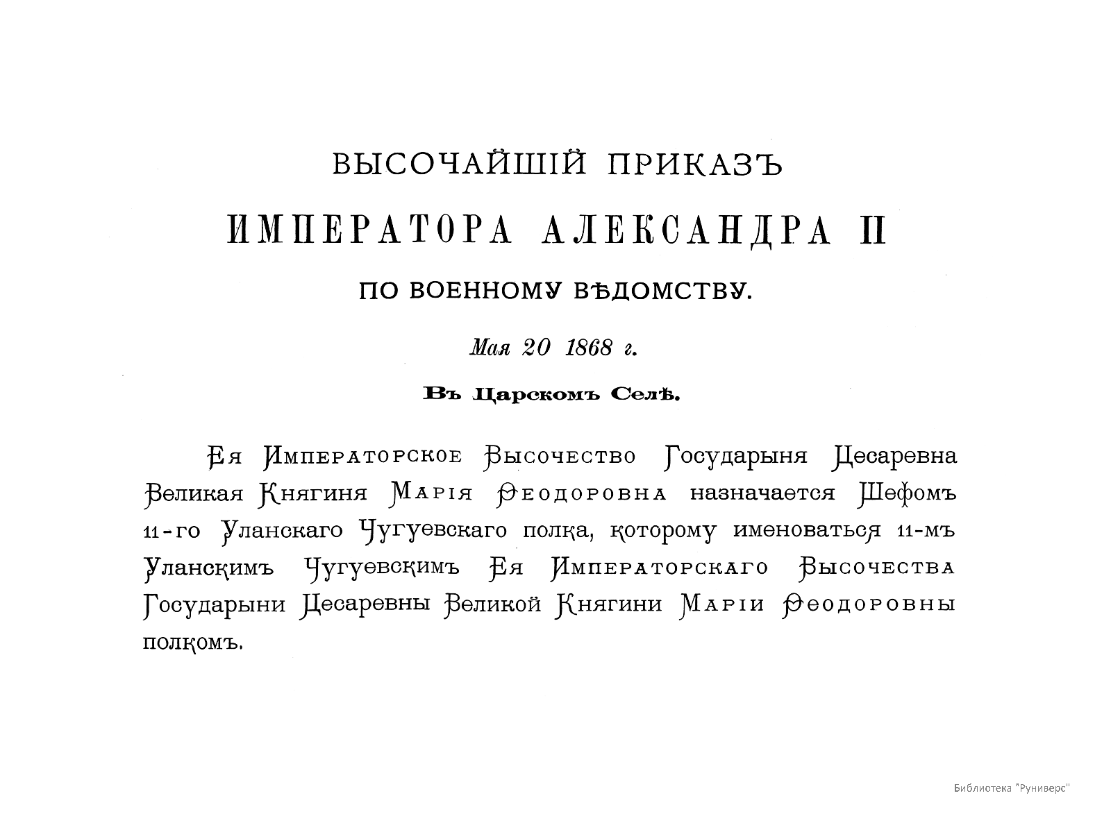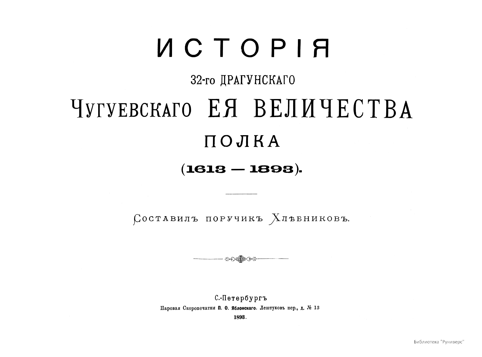 Издание «История 32-го драгунского Чугуевского ее величества полка: 1613–1893» вышло в свет в Санкт-Петербурге в 1893 г. Выпуск книги был приурочен к юбилейной дате: двадцатипятилетию со дня назначения августейшим шефом полка императрицы Марии Федоровны. Назначение было произведено в 1868 г. согласно указу императора Александра II, которому императрица Мария Федоровна, тогда еще цесаревна Дагмара, приходилась невесткой.