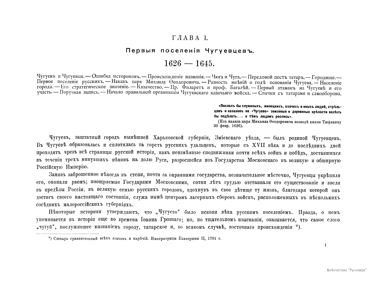 Чугуевский полк отличался бесстрашием и особенным почитанием боевых традиций; участвовал в Северной войне (за что удостоился своих первых привилегий), в русско-польской войне 1733–1735 гг., в подавлении восстания Емельяна Пугачева. За отличие в Лейпцигской кампании 1813 г. полку были пожалованы 17 серебряных Георгиевских труб. В 1918 г. Чугуевский полк был расформирован. Время возникновения и расформирования полка почти мистически совпадают с датами начала и трагического конца правления династии Романовых.