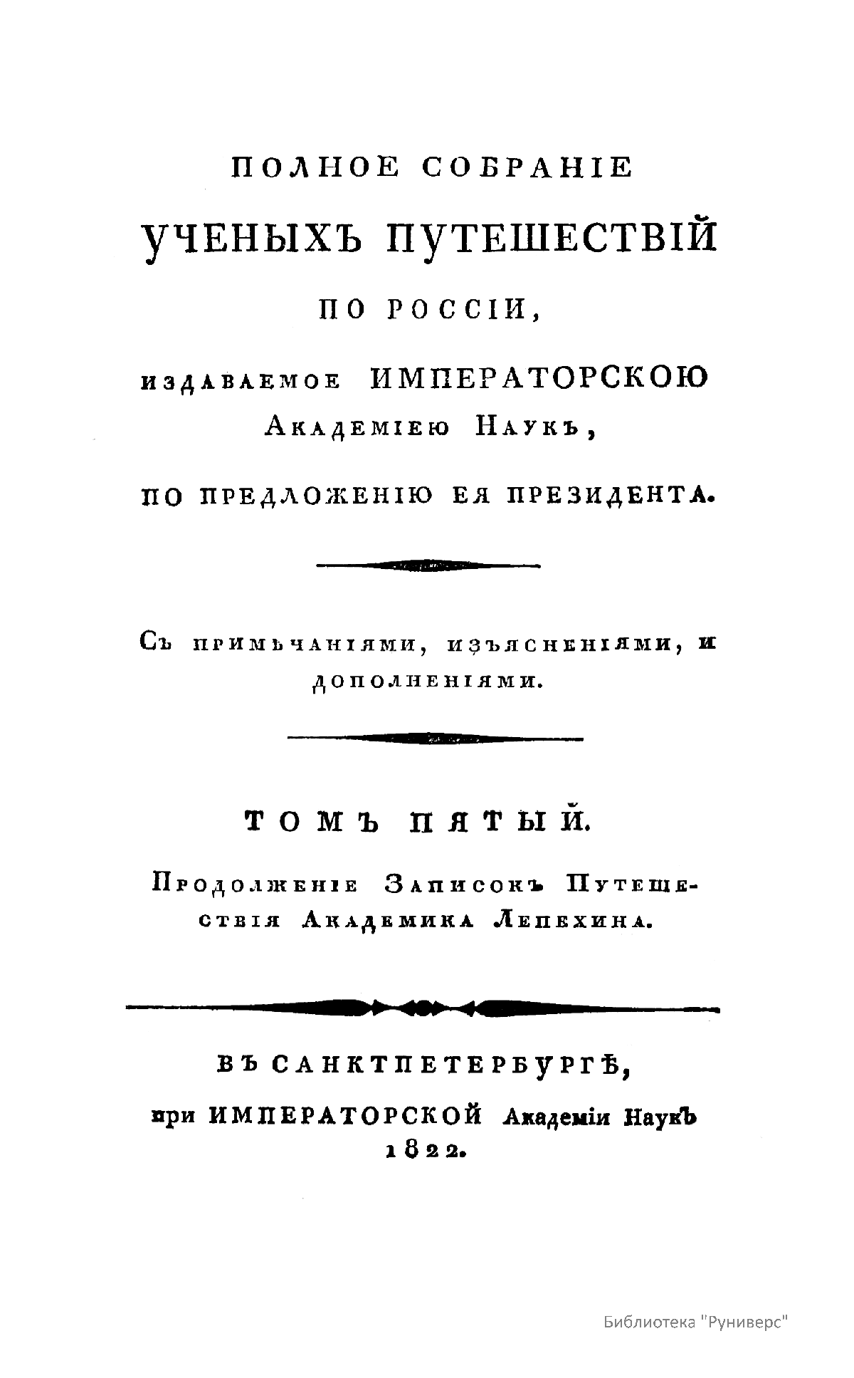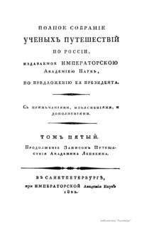 Полное собрание ученых путешествий по России, издаваемое Императорскою Академией Наук, по предложению ее президента. Том пятый. Продолжение Записок Путешествия Академика Лепехина