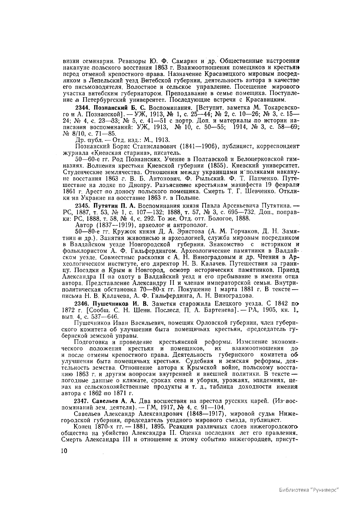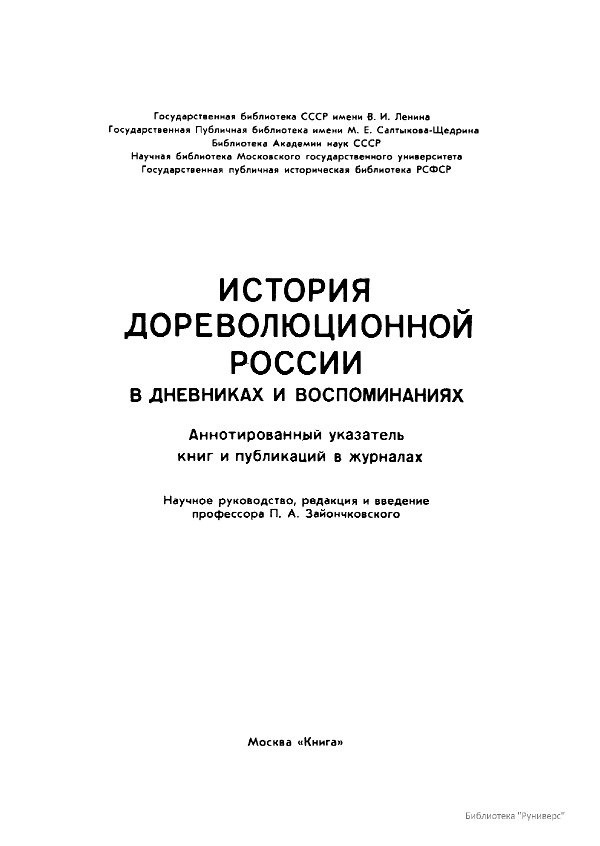 Многотомное издание этого уникального библиографического исследования, ставшего итогом многолетней работы большого коллектива ведущих отечественных источниковедов и библиографов главных библиотек нашей страны, представляет собой крупнейшее собрание аннотированной мемуарной литературы по истории России. Ведущую роль в создании этого фундаментального издания сыграл крупный отечественный ученый-историк П.А. Зайончковский, под редакцией и неусыпным контролем которого разрабатывался и выходил представленный многотомник (последние 5 книг вышли после кончины этого замечательного учёного-энциклопедиста).
