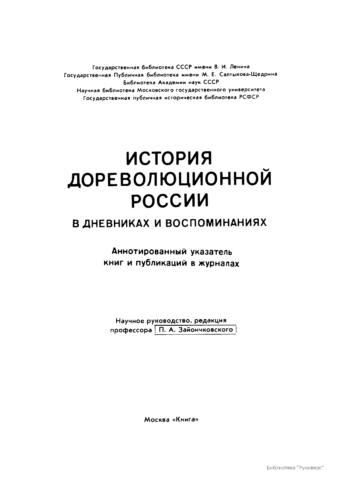 Многотомное издание этого уникального библиографического исследования, ставшего итогом многолетней работы большого коллектива ведущих отечественных источниковедов и библиографов главных библиотек нашей страны, представляет собой крупнейшее собрание аннотированной мемуарной литературы по истории России. Ведущую роль в создании этого фундаментального издания сыграл крупный отечественный ученый-историк П.А. Зайончковский, под редакцией и неусыпным контролем которого разрабатывался и выходил представленный многотомник (последние 5 книг вышли после кончины этого замечательного учёного-энциклопедиста).