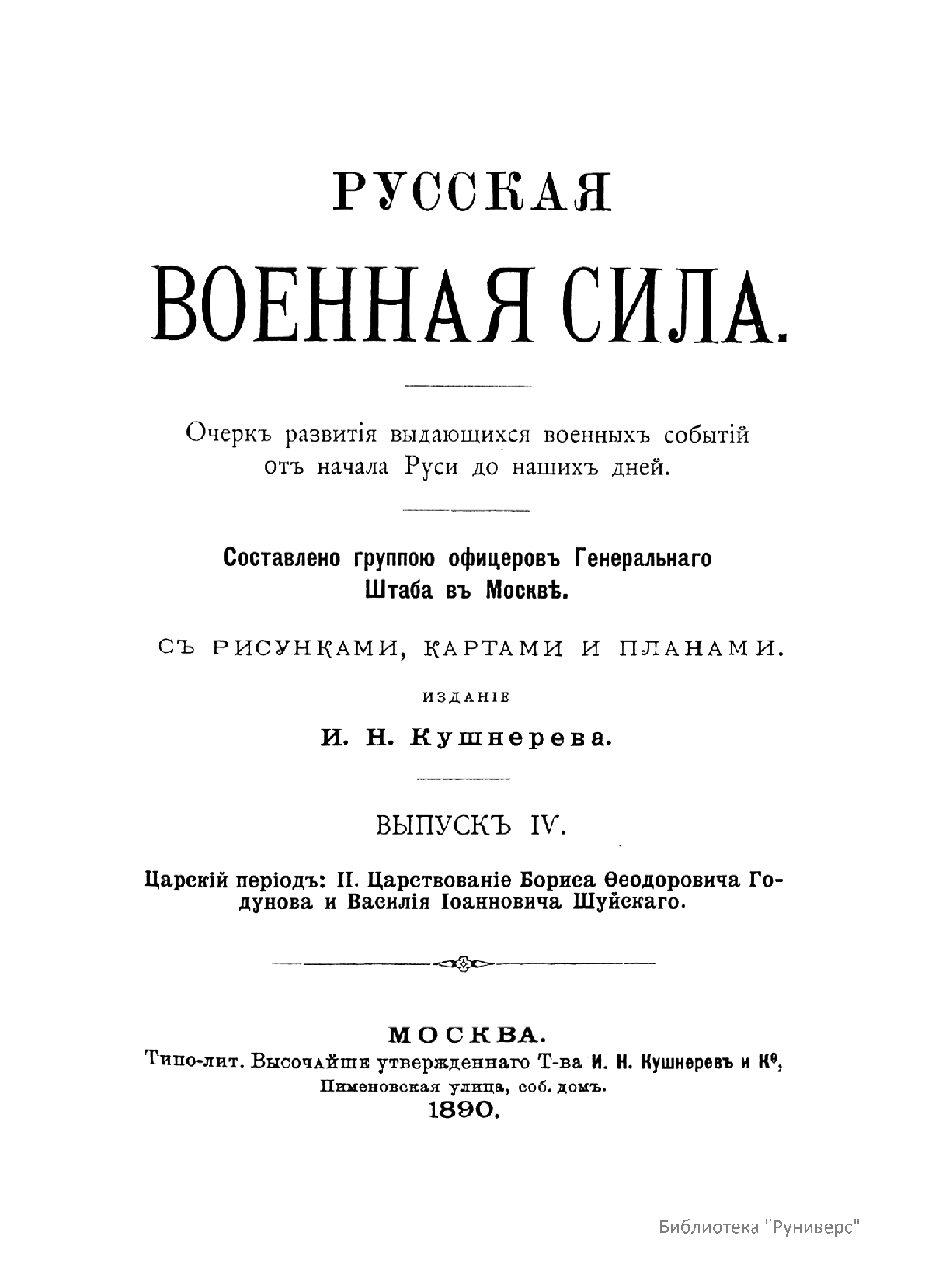 «Русская военная сила» (Очерк развития выдающихся военных событий от начала Руси до наших дней), составленная обществом офицеров Генерального штаба в Москве, начала публиковаться с 1888 г. «Русская военная сила» по праву считалась одним из лучших сводных общедоступных исследований по российской военной истории.