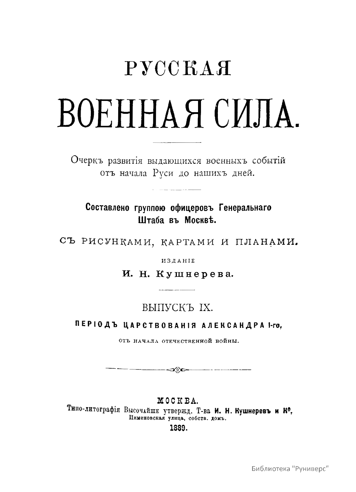 «Русская военная сила» (Очерк развития выдающихся военных событий от начала Руси до наших дней), составленная обществом офицеров Генерального штаба в Москве, начала публиковаться с 1888 г. «Русская военная сила» по праву считалась одним из лучших сводных общедоступных исследований по российской военной истории.