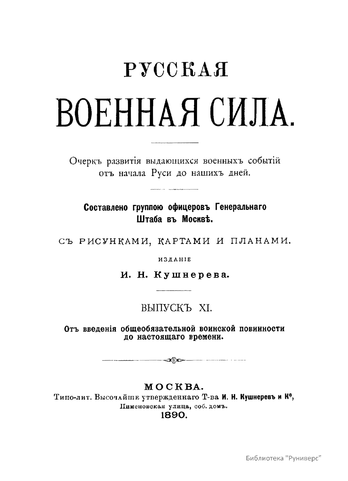 «Русская военная сила» (Очерк развития выдающихся военных событий от начала Руси до наших дней), составленная обществом офицеров Генерального штаба в Москве, начала публиковаться с 1888 г. «Русская военная сила» по праву считалась одним из лучших сводных общедоступных исследований по российской военной истории.