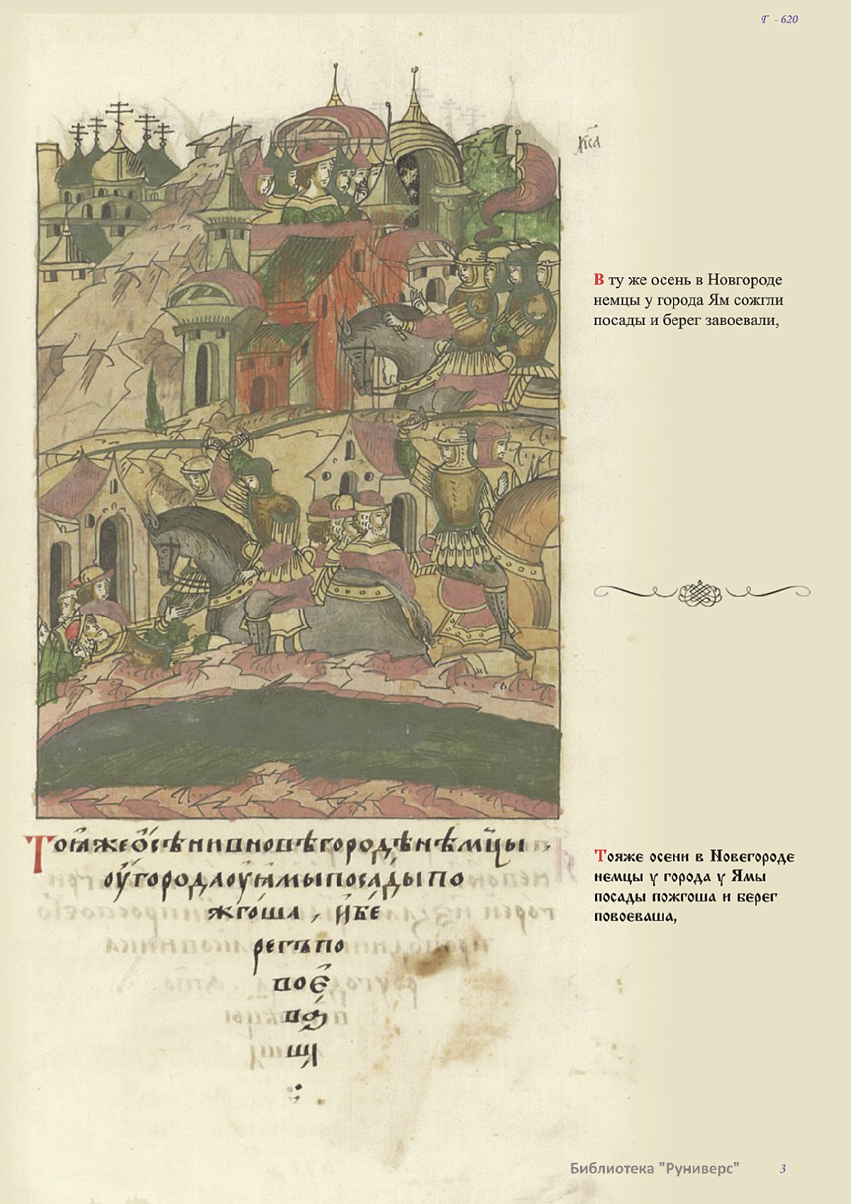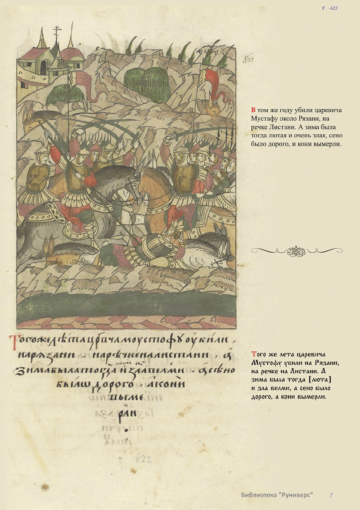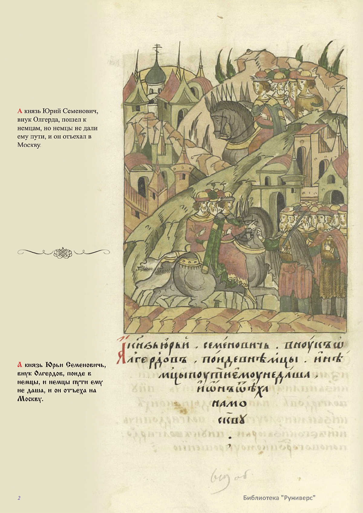Лицевой летописный свод. XVI века — монументальный памятник древнерусского книжного искусства. На 10 тысячах листов с более чем 17 тысячами красочных миниатюр — «окон в историю» — представлена самая ранняя историческая и литературная энциклопедия. Лицевой свод дошел до наших дней в 10 томах, находящихся в разных древлехранилищах: БАН к РНБ в Санкт-Петербурге и ГИМ в Москве. Фирма «АКТЕОН» совместно с хранителями впервые осуществила научное факсимильное издание «Лицевой летописный свод XVI века». Предлагаемое издание с переводом — как дополнение в рамках научного аппарата вышеназванного факсимиле - представлено тремя разделами: библейская история, всемирная история, русская летописная история. В настоящем издании листы расположены в хронологическом порядке повествования На внешнем поле размещены транслитерация и перевод на современный русский язык. Русская летописная история 1114—1567 гг. — отражена на 6010 Лицевого летописного свода XVI века в следующих его томах: Г — Голицынский том (Отдел рукописей Российский национальной библиотеки, F.IV.225), Л — Лаптевский TOM (Отдел рукописей Российской национальной библиотеки, F.IV.233), O-I — Остермановский первый том (Отдел рукописей Библиотеки Академии наук, 31. 7. 30-1), O-II — Остермановский второй той (Отдел рукописей Библиотеки Академии наук, 31, 7. 30-2), Ш — Шумиловский том (Отдел рукописей Российской национальной библиотеки, F, IY. 232), С — Синодальный том (Отдел рукописей Государственного Исторического музея. Син. № 962), Ц— Царственная книга (Отдел рукописей Государственного Историческою музея. Син. № 149). В сносках отряжены разночтения с перепей ПСРЛ — Полным собранием русских летописей - фундаментальной для изучения истории древней и средневековой Руси книжной серией (её тексты, в основном, издавались наборно, в орфографии XIX века).