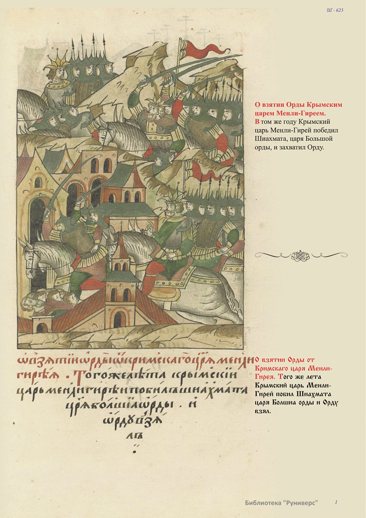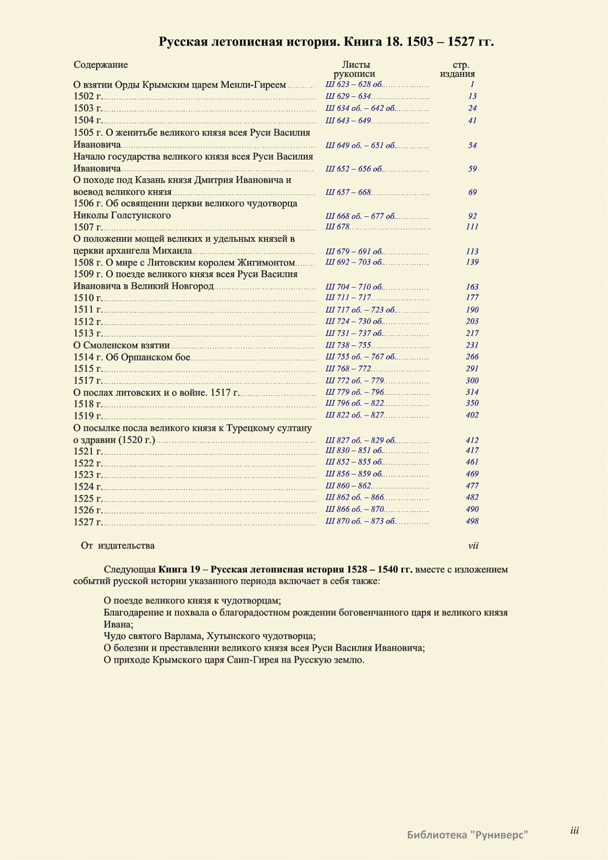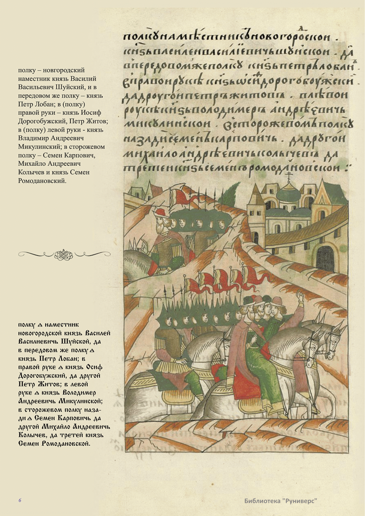 Лицевой летописный свод. XVI века — монументальный памятник древнерусского книжного искусства. На 10 тысячах листов с более чем 17 тысячами красочных миниатюр — «окон в историю» — представлена самая ранняя историческая и литературная энциклопедия. Лицевой свод дошел до наших дней в 10 томах, находящихся в разных древлехранилищах: БАН к РНБ в Санкт-Петербурге и ГИМ в Москве. Фирма «АКТЕОН» совместно с хранителями впервые осуществила научное факсимильное издание «Лицевой летописный свод XVI века». Предлагаемое издание с переводом — как дополнение в рамках научного аппарата вышеназванного факсимиле - представлено тремя разделами: библейская история, всемирная история, русская летописная история. В настоящем издании листы расположены в хронологическом порядке повествования На внешнем поле размещены транслитерация и перевод на современный русский язык. Русская летописная история 1114—1567 гг. — отражена на 6010 Лицевого летописного свода XVI века в следующих его томах: Г — Голицынский том (Отдел рукописей Российский национальной библиотеки, F.IV.225), Л — Лаптевский TOM (Отдел рукописей Российской национальной библиотеки, F.IV.233), O-I — Остермановский первый том (Отдел рукописей Библиотеки Академии наук, 31. 7. 30-1), O-II — Остермановский второй той (Отдел рукописей Библиотеки Академии наук, 31, 7. 30-2), Ш — Шумиловский том (Отдел рукописей Российской национальной библиотеки, F, IY. 232), С — Синодальный том (Отдел рукописей Государственного Исторического музея. Син. № 962), Ц— Царственная книга (Отдел рукописей Государственного Историческою музея. Син. № 149). В сносках отряжены разночтения с перепей ПСРЛ — Полным собранием русских летописей - фундаментальной для изучения истории древней и средневековой Руси книжной серией (её тексты, в основном, издавались наборно, в орфографии XIX века).