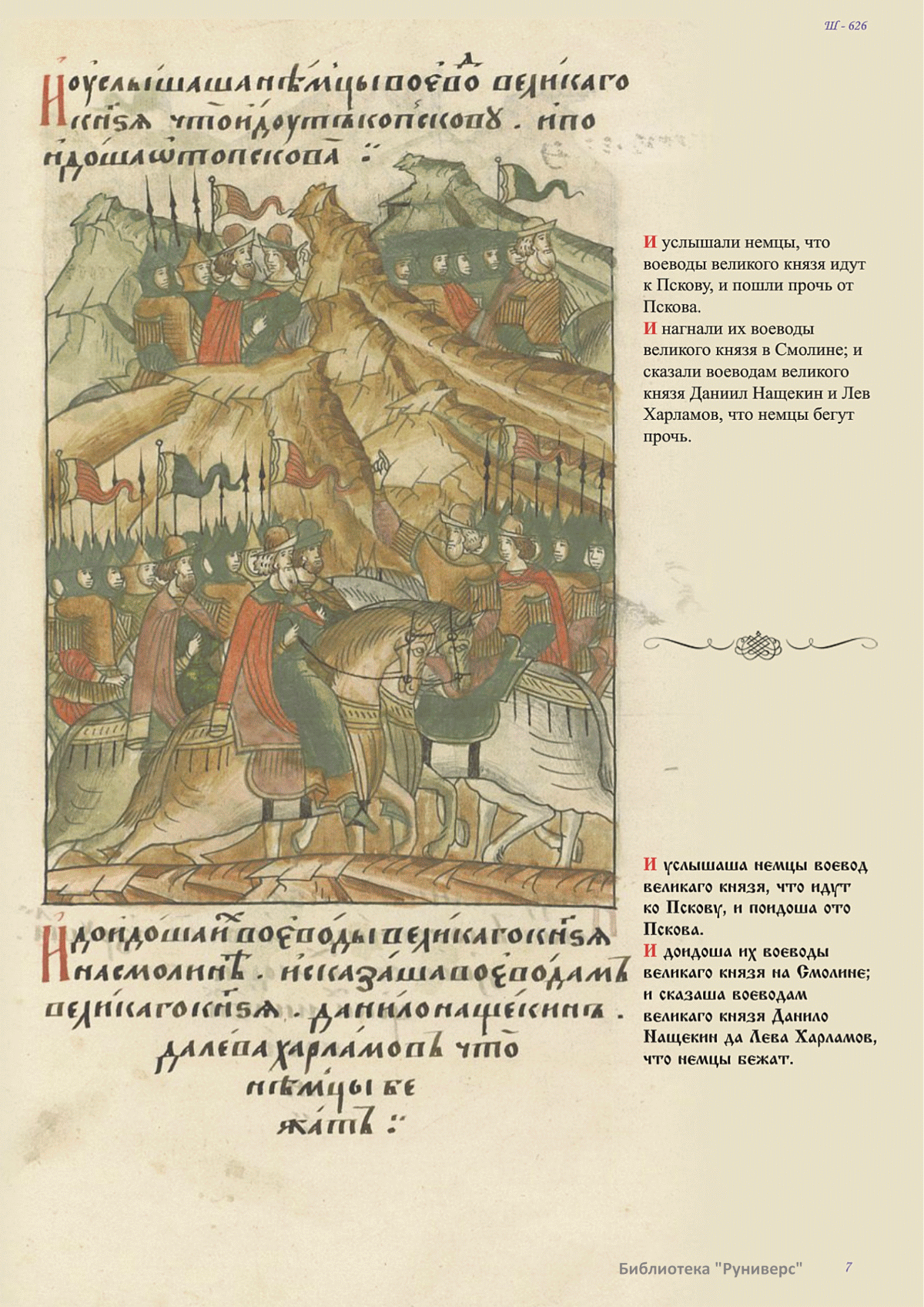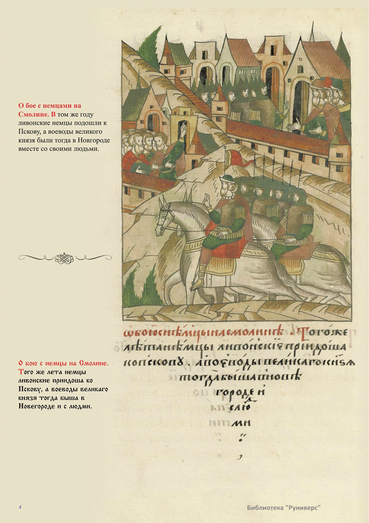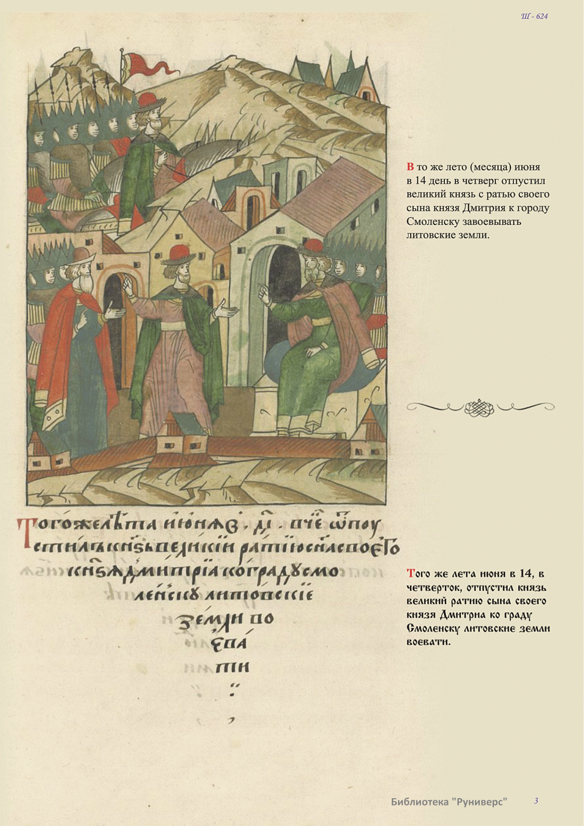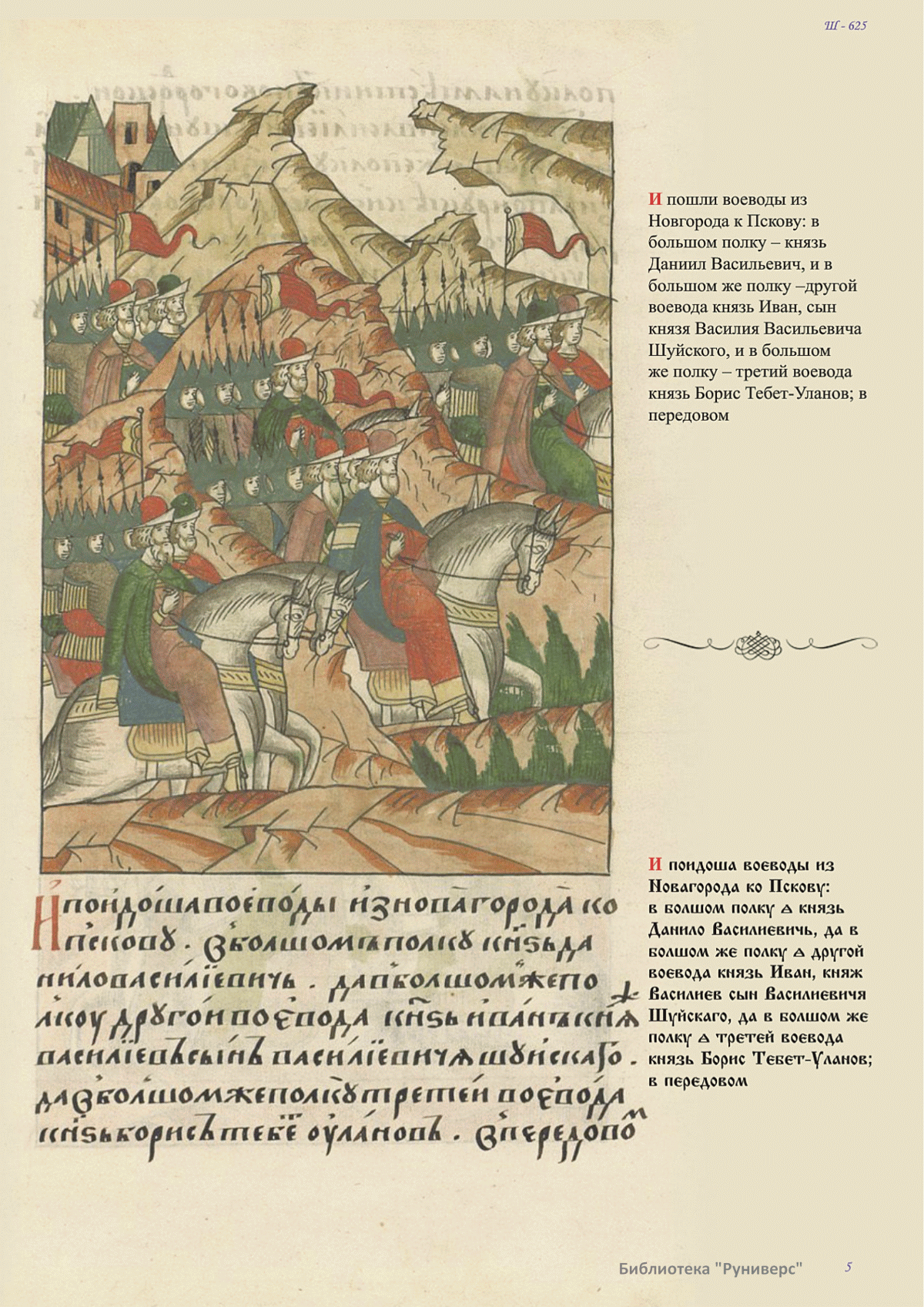 Лицевой летописный свод. XVI века — монументальный памятник древнерусского книжного искусства. На 10 тысячах листов с более чем 17 тысячами красочных миниатюр — «окон в историю» — представлена самая ранняя историческая и литературная энциклопедия. Лицевой свод дошел до наших дней в 10 томах, находящихся в разных древлехранилищах: БАН к РНБ в Санкт-Петербурге и ГИМ в Москве. Фирма «АКТЕОН» совместно с хранителями впервые осуществила научное факсимильное издание «Лицевой летописный свод XVI века». Предлагаемое издание с переводом — как дополнение в рамках научного аппарата вышеназванного факсимиле - представлено тремя разделами: библейская история, всемирная история, русская летописная история. В настоящем издании листы расположены в хронологическом порядке повествования На внешнем поле размещены транслитерация и перевод на современный русский язык. Русская летописная история 1114—1567 гг. — отражена на 6010 Лицевого летописного свода XVI века в следующих его томах: Г — Голицынский том (Отдел рукописей Российский национальной библиотеки, F.IV.225), Л — Лаптевский TOM (Отдел рукописей Российской национальной библиотеки, F.IV.233), O-I — Остермановский первый том (Отдел рукописей Библиотеки Академии наук, 31. 7. 30-1), O-II — Остермановский второй той (Отдел рукописей Библиотеки Академии наук, 31, 7. 30-2), Ш — Шумиловский том (Отдел рукописей Российской национальной библиотеки, F, IY. 232), С — Синодальный том (Отдел рукописей Государственного Исторического музея. Син. № 962), Ц— Царственная книга (Отдел рукописей Государственного Историческою музея. Син. № 149). В сносках отряжены разночтения с перепей ПСРЛ — Полным собранием русских летописей - фундаментальной для изучения истории древней и средневековой Руси книжной серией (её тексты, в основном, издавались наборно, в орфографии XIX века).