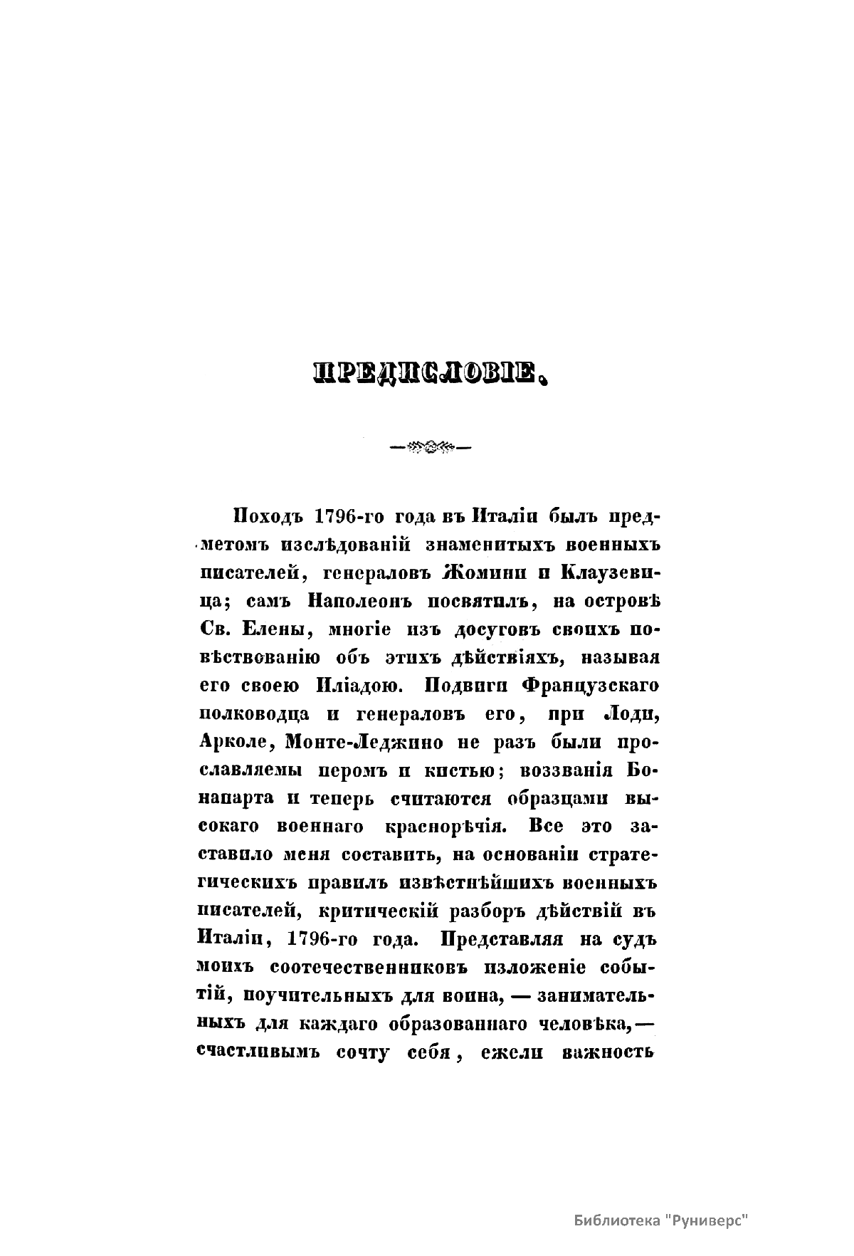 Подвиги великого полководца Бонапарта были увековечены в книгах и полотнах, его воззвания общепризнанны за образцы высокого военного красноречия. «Поход 1796 года Бонапарта в Италии» — первое сочинение подполковника, профессора Императорской военной академии М. И. Богдановича. Книга выпущена в 1845 г. в Санкт-Петербурге. Труд представляет собой критический обзор боевых действий в Италии во время войны 1796–1797 гг. Франции с первой коалицией европейских держав (Австрия, Великобритания, Россия, Сардиния, Королевство обеих Сицилий и др.). Он составлен на основе произведений известнейших военных писателей Г. В. Жомини, К. Клаузевица, мемуаров Наполеона и др. Здесь рассмотрена талантливая стратегия и тактика генерала Наполеона Бонапарта, под командованием которого французские войска выигрывали сражения с превосходящими силами австро-сардинских войск. К историческому описанию военных действий приложены пять карт и планов местностей, напечатанные на одном складном листе, и отдельно — «Карта Северной Италии». Повествование дополнено кратким очерком похода 1797 г. до заключения перемирия в Леобене.