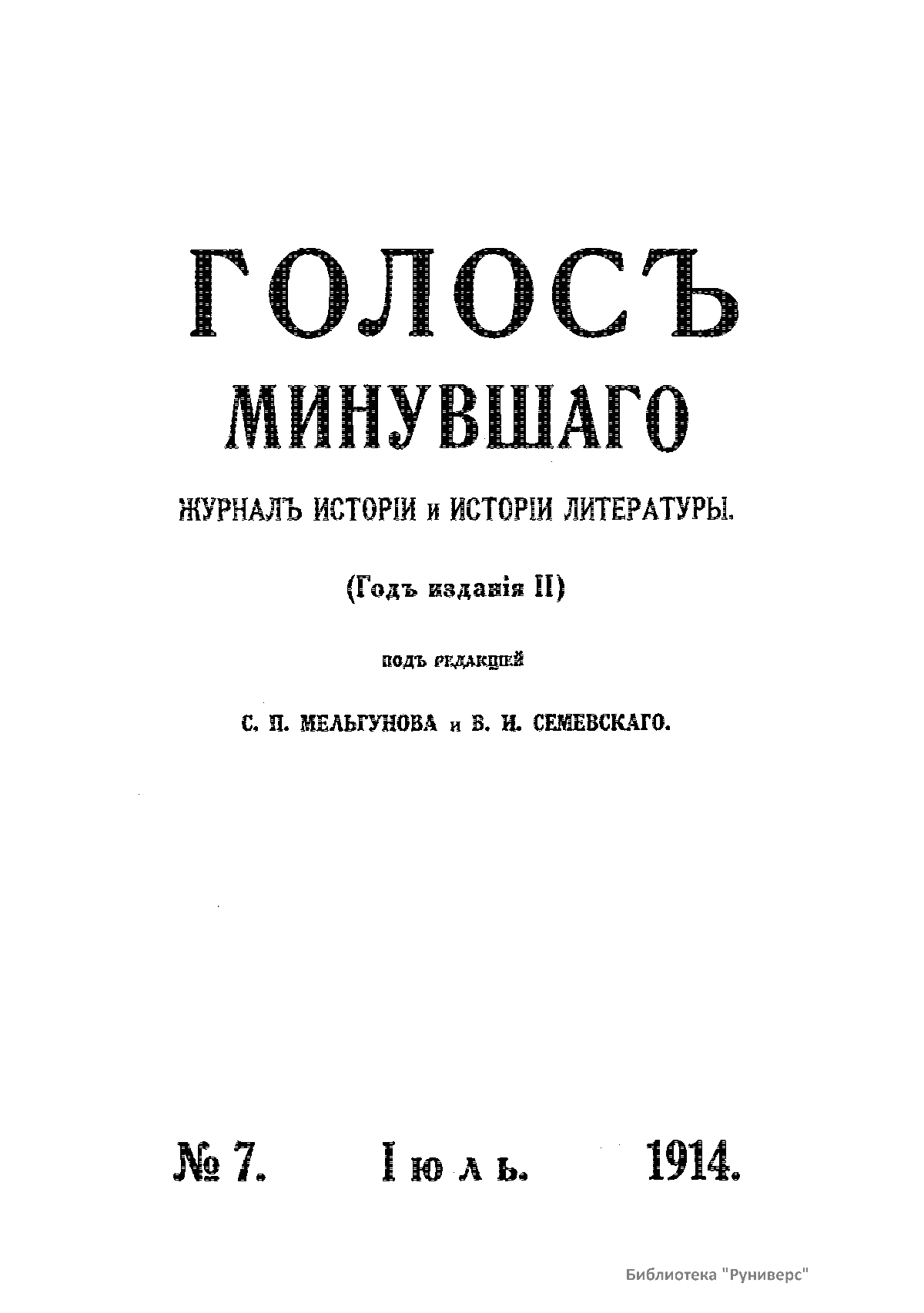 «Голос Минувшего» — журнал истории и истории литературы либерально-народнического направления, издававшийся в Москве с 1913 по 1923 год. Издателем журнала в 1913–1922 годах были известные русские историки, публицисты и общественные деятели С. П. Мельгунов (1880–1956) и В. И. Семевский (1848–1916). В редакционную коллегию также входили А. К. Дживелегов и П. Н. Сакулин. До 1919 «Голос минувшего» выходил ежемесячно, затем нерегулярно, всего было выпущено 65 номеров. В журнале публиковались интереснейшие материалы, посвященные истории литературы и общественных движений в России второй половины XVIII – начала XX веков. Здесь можно найти: статьи по вопросам русской и всеобщей истории, истории литературы, философии, искусства и археологии. В издании представлены: историческая беллетристика, биографии русских и иностранных деятелей, критика и библиография, новости русской и иностранной науки, обзор журналов русских и иностранных, хроника, мемуары, записки, дневники и письма декабристов, видных народовольцев и эсеров, крупных общественных деятелей и царских администраторов, писателей, военачальников и др. Среди авторов: Е. В. Тарле, А. Ф. Кони, А. К. Дживелегов, А. А. Кизеветтер, В. Г. Короленко и др. Стремление сделать журнал интересным для более широкого круга читателей способствовало тому, что в «Голосе Минувшего», хоть и в ограниченном количестве, печатались статьи по истории искусства и помещались иллюстрации: портреты, картины и рисунки, не знакомые или мало знакомые публике. В журнале опубликован целый ряд интересных писем, документов и воспоминаний. Абсолютное большинство текстов никогда не переиздавалось. Журнал снабжен указателями имен за 1913–1922 годы и систематическим указателем содержания.