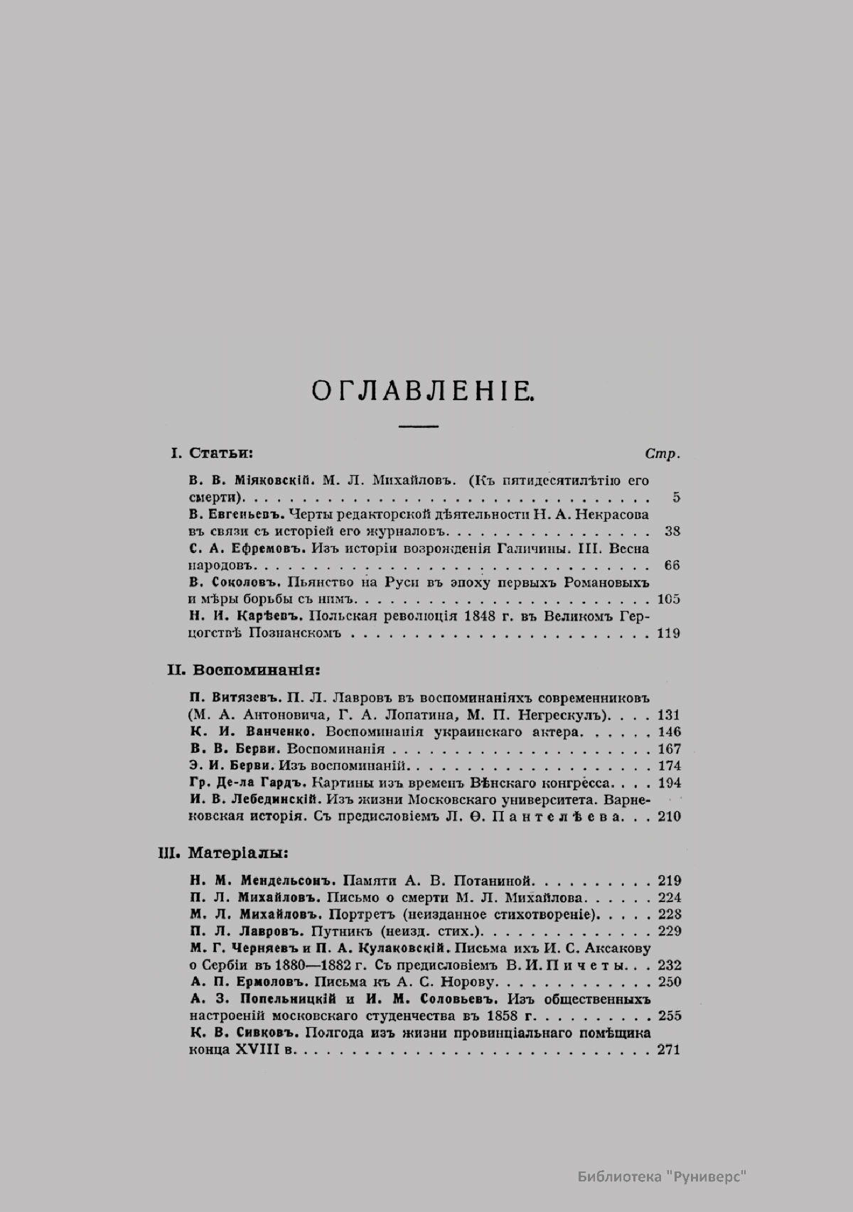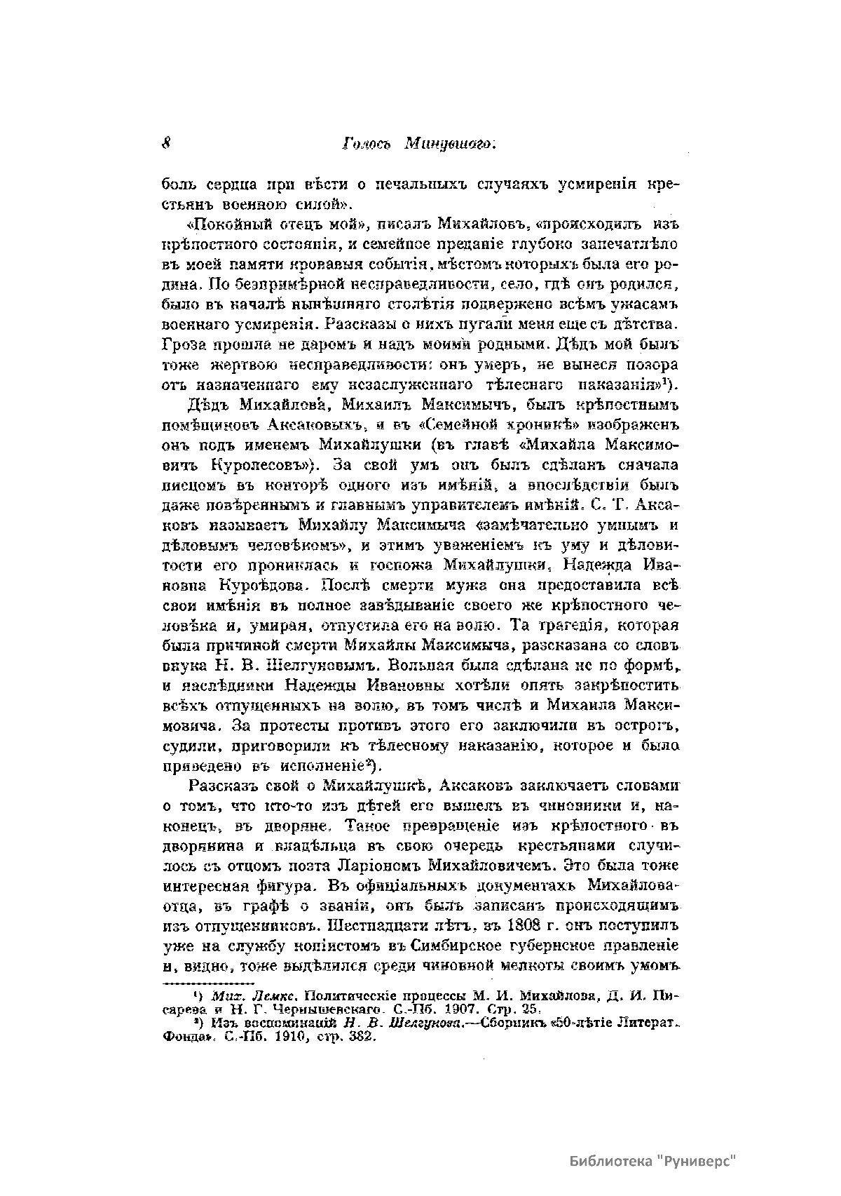 «Голос Минувшего» — журнал истории и истории литературы либерально-народнического направления, издававшийся в Москве с 1913 по 1923 год. Издателем журнала в 1913–1922 годах были известные русские историки, публицисты и общественные деятели С. П. Мельгунов (1880–1956) и В. И. Семевский (1848–1916). В редакционную коллегию также входили А. К. Дживелегов и П. Н. Сакулин. До 1919 «Голос минувшего» выходил ежемесячно, затем нерегулярно, всего было выпущено 65 номеров. В журнале публиковались интереснейшие материалы, посвященные истории литературы и общественных движений в России второй половины XVIII – начала XX веков. Здесь можно найти: статьи по вопросам русской и всеобщей истории, истории литературы, философии, искусства и археологии. В издании представлены: историческая беллетристика, биографии русских и иностранных деятелей, критика и библиография, новости русской и иностранной науки, обзор журналов русских и иностранных, хроника, мемуары, записки, дневники и письма декабристов, видных народовольцев и эсеров, крупных общественных деятелей и царских администраторов, писателей, военачальников и др. Среди авторов: Е. В. Тарле, А. Ф. Кони, А. К. Дживелегов, А. А. Кизеветтер, В. Г. Короленко и др. Стремление сделать журнал интересным для более широкого круга читателей способствовало тому, что в «Голосе Минувшего», хоть и в ограниченном количестве, печатались статьи по истории искусства и помещались иллюстрации: портреты, картины и рисунки, не знакомые или мало знакомые публике. В журнале опубликован целый ряд интересных писем, документов и воспоминаний. Абсолютное большинство текстов никогда не переиздавалось. Журнал снабжен указателями имен за 1913–1922 годы и систематическим указателем содержания.