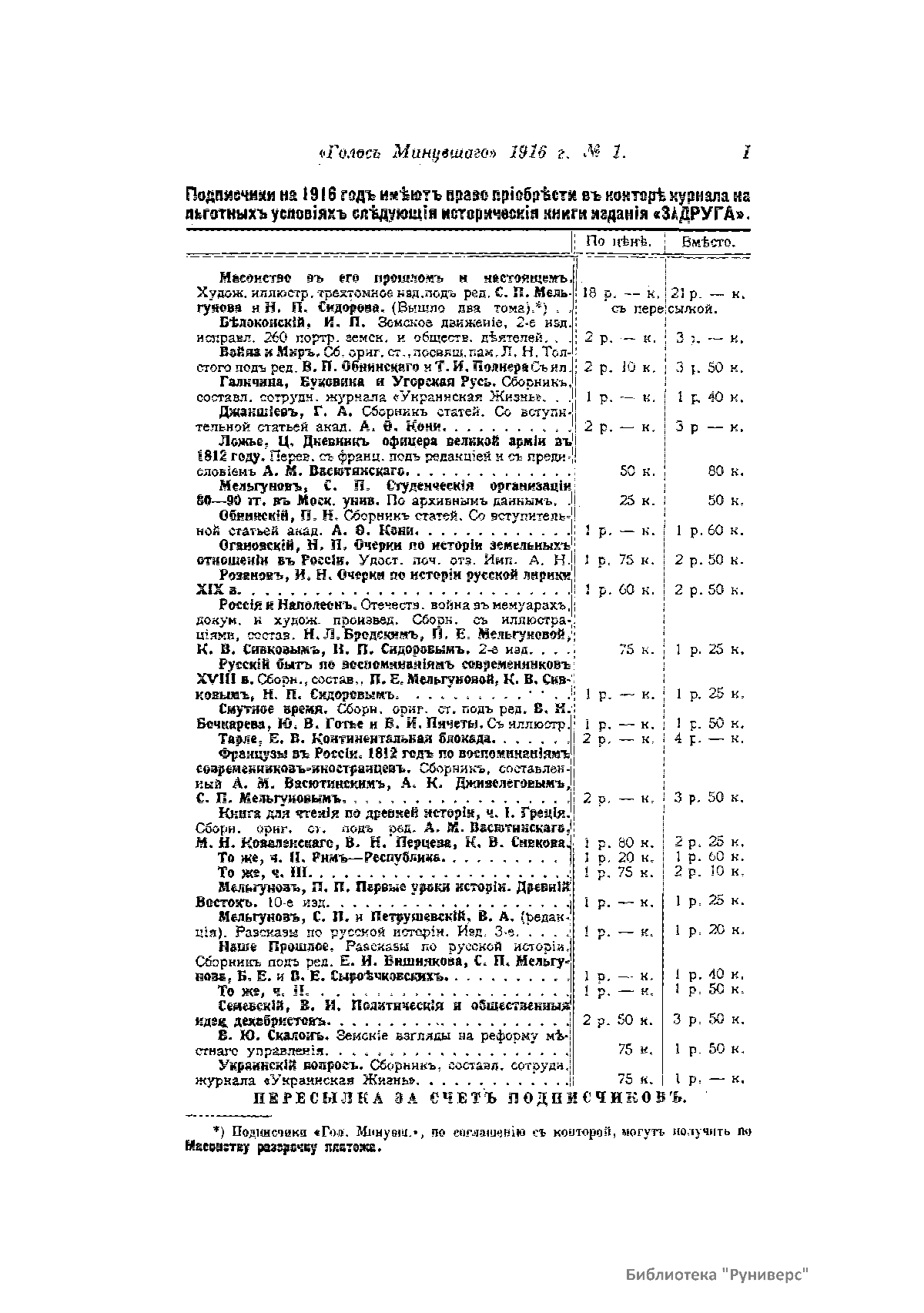 «Голос Минувшего» — журнал истории и истории литературы либерально-народнического направления, издававшийся в Москве с 1913 по 1923 год. Издателем журнала в 1913–1922 годах были известные русские историки, публицисты и общественные деятели С. П. Мельгунов (1880–1956) и В. И. Семевский (1848–1916). В редакционную коллегию также входили А. К. Дживелегов и П. Н. Сакулин. До 1919 «Голос минувшего» выходил ежемесячно, затем нерегулярно, всего было выпущено 65 номеров. В журнале публиковались интереснейшие материалы, посвященные истории литературы и общественных движений в России второй половины XVIII – начала XX веков. Здесь можно найти: статьи по вопросам русской и всеобщей истории, истории литературы, философии, искусства и археологии. В издании представлены: историческая беллетристика, биографии русских и иностранных деятелей, критика и библиография, новости русской и иностранной науки, обзор журналов русских и иностранных, хроника, мемуары, записки, дневники и письма декабристов, видных народовольцев и эсеров, крупных общественных деятелей и царских администраторов, писателей, военачальников и др. Среди авторов: Е. В. Тарле, А. Ф. Кони, А. К. Дживелегов, А. А. Кизеветтер, В. Г. Короленко и др. Стремление сделать журнал интересным для более широкого круга читателей способствовало тому, что в «Голосе Минувшего», хоть и в ограниченном количестве, печатались статьи по истории искусства и помещались иллюстрации: портреты, картины и рисунки, не знакомые или мало знакомые публике. В журнале опубликован целый ряд интересных писем, документов и воспоминаний. Абсолютное большинство текстов никогда не переиздавалось. Журнал снабжен указателями имен за 1913–1922 годы и систематическим указателем содержания.