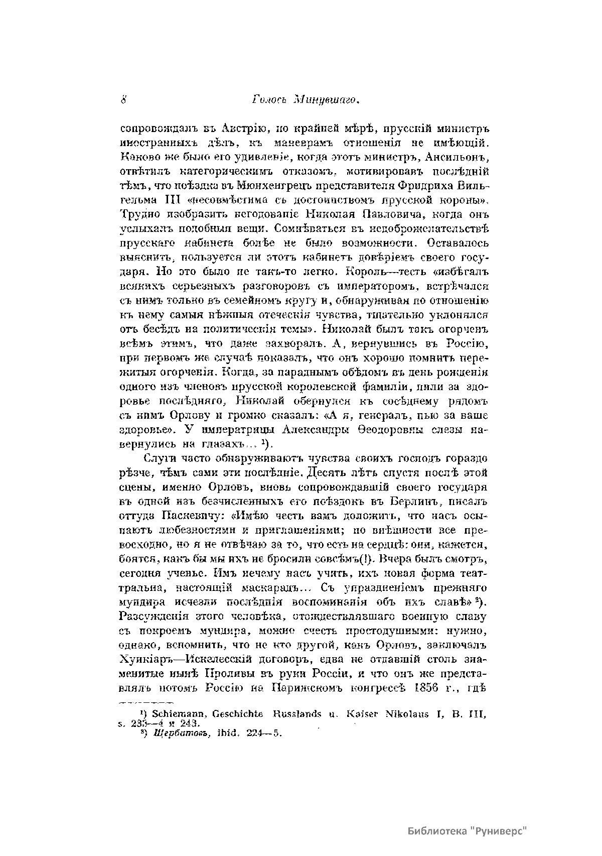 «Голос Минувшего» — журнал истории и истории литературы либерально-народнического направления, издававшийся в Москве с 1913 по 1923 год. Издателем журнала в 1913–1922 годах были известные русские историки, публицисты и общественные деятели С. П. Мельгунов (1880–1956) и В. И. Семевский (1848–1916). В редакционную коллегию также входили А. К. Дживелегов и П. Н. Сакулин. До 1919 «Голос минувшего» выходил ежемесячно, затем нерегулярно, всего было выпущено 65 номеров. В журнале публиковались интереснейшие материалы, посвященные истории литературы и общественных движений в России второй половины XVIII – начала XX веков. Здесь можно найти: статьи по вопросам русской и всеобщей истории, истории литературы, философии, искусства и археологии. В издании представлены: историческая беллетристика, биографии русских и иностранных деятелей, критика и библиография, новости русской и иностранной науки, обзор журналов русских и иностранных, хроника, мемуары, записки, дневники и письма декабристов, видных народовольцев и эсеров, крупных общественных деятелей и царских администраторов, писателей, военачальников и др. Среди авторов: Е. В. Тарле, А. Ф. Кони, А. К. Дживелегов, А. А. Кизеветтер, В. Г. Короленко и др. Стремление сделать журнал интересным для более широкого круга читателей способствовало тому, что в «Голосе Минувшего», хоть и в ограниченном количестве, печатались статьи по истории искусства и помещались иллюстрации: портреты, картины и рисунки, не знакомые или мало знакомые публике. В журнале опубликован целый ряд интересных писем, документов и воспоминаний. Абсолютное большинство текстов никогда не переиздавалось. Журнал снабжен указателями имен за 1913–1922 годы и систематическим указателем содержания.