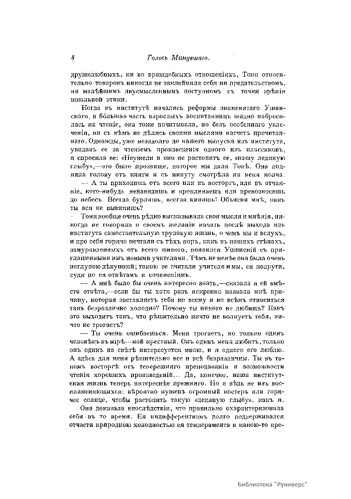 «Голос Минувшего» — журнал истории и истории литературы либерально-народнического направления, издававшийся в Москве с 1913 по 1923 год. Издателем журнала в 1913–1922 годах были известные русские историки, публицисты и общественные деятели С. П. Мельгунов (1880–1956) и В. И. Семевский (1848–1916). В редакционную коллегию также входили А. К. Дживелегов и П. Н. Сакулин. До 1919 «Голос минувшего» выходил ежемесячно, затем нерегулярно, всего было выпущено 65 номеров. В журнале публиковались интереснейшие материалы, посвященные истории литературы и общественных движений в России второй половины XVIII – начала XX веков. Здесь можно найти: статьи по вопросам русской и всеобщей истории, истории литературы, философии, искусства и археологии. В издании представлены: историческая беллетристика, биографии русских и иностранных деятелей, критика и библиография, новости русской и иностранной науки, обзор журналов русских и иностранных, хроника, мемуары, записки, дневники и письма декабристов, видных народовольцев и эсеров, крупных общественных деятелей и царских администраторов, писателей, военачальников и др. Среди авторов: Е. В. Тарле, А. Ф. Кони, А. К. Дживелегов, А. А. Кизеветтер, В. Г. Короленко и др. Стремление сделать журнал интересным для более широкого круга читателей способствовало тому, что в «Голосе Минувшего», хоть и в ограниченном количестве, печатались статьи по истории искусства и помещались иллюстрации: портреты, картины и рисунки, не знакомые или мало знакомые публике. В журнале опубликован целый ряд интересных писем, документов и воспоминаний. Абсолютное большинство текстов никогда не переиздавалось. Журнал снабжен указателями имен за 1913–1922 годы и систематическим указателем содержания.