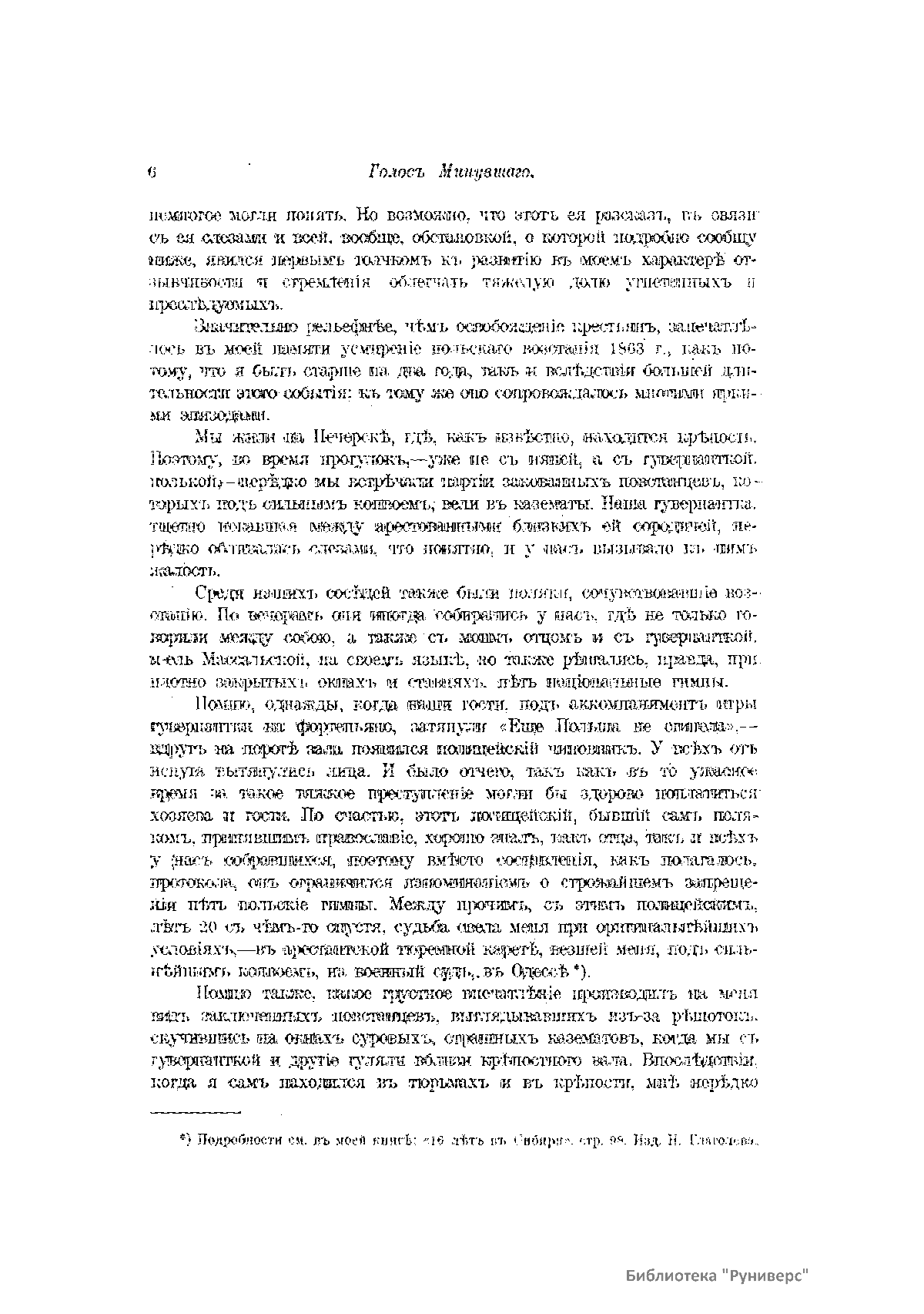 «Голос Минувшего» — журнал истории и истории литературы либерально-народнического направления, издававшийся в Москве с 1913 по 1923 год. Издателем журнала в 1913–1922 годах были известные русские историки, публицисты и общественные деятели С. П. Мельгунов (1880–1956) и В. И. Семевский (1848–1916). В редакционную коллегию также входили А. К. Дживелегов и П. Н. Сакулин. До 1919 «Голос минувшего» выходил ежемесячно, затем нерегулярно, всего было выпущено 65 номеров. В журнале публиковались интереснейшие материалы, посвященные истории литературы и общественных движений в России второй половины XVIII – начала XX веков. Здесь можно найти: статьи по вопросам русской и всеобщей истории, истории литературы, философии, искусства и археологии. В издании представлены: историческая беллетристика, биографии русских и иностранных деятелей, критика и библиография, новости русской и иностранной науки, обзор журналов русских и иностранных, хроника, мемуары, записки, дневники и письма декабристов, видных народовольцев и эсеров, крупных общественных деятелей и царских администраторов, писателей, военачальников и др. Среди авторов: Е. В. Тарле, А. Ф. Кони, А. К. Дживелегов, А. А. Кизеветтер, В. Г. Короленко и др. Стремление сделать журнал интересным для более широкого круга читателей способствовало тому, что в «Голосе Минувшего», хоть и в ограниченном количестве, печатались статьи по истории искусства и помещались иллюстрации: портреты, картины и рисунки, не знакомые или мало знакомые публике. В журнале опубликован целый ряд интересных писем, документов и воспоминаний. Абсолютное большинство текстов никогда не переиздавалось. Журнал снабжен указателями имен за 1913–1922 годы и систематическим указателем содержания.