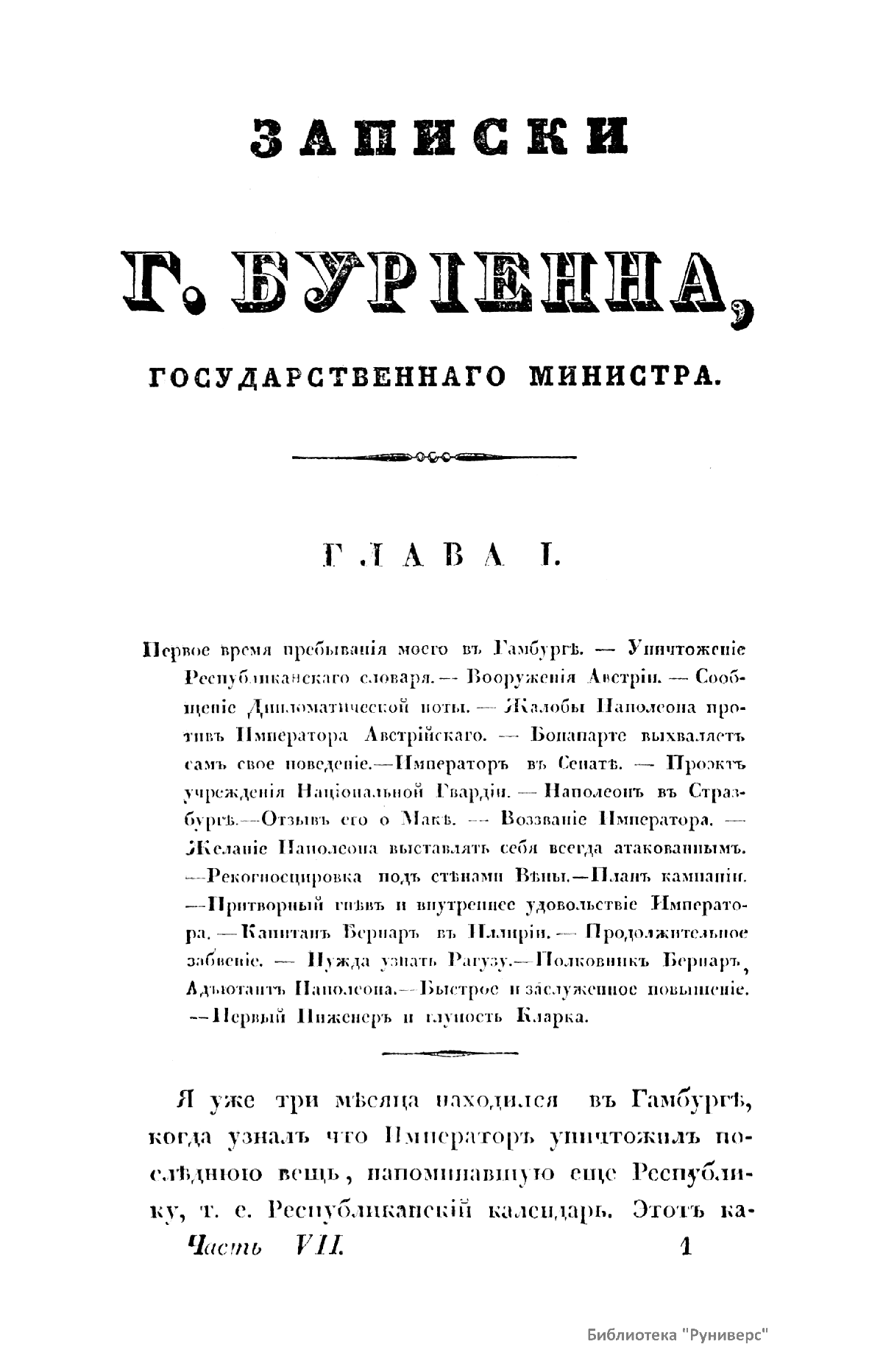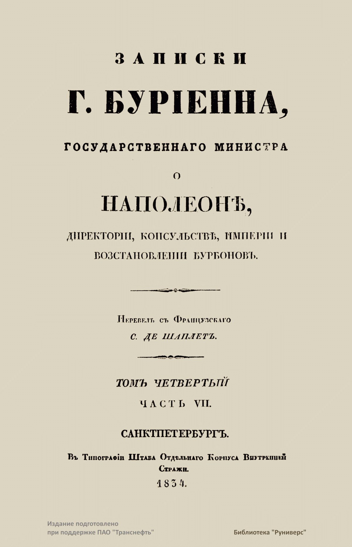 Записки г. Бурiенна, государственнаго министра о Наполеонѣ, директорiи, консульствѣ, Имперiи и возстановленiи Бурбоновъ. Томъ четвертый