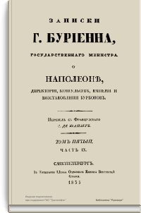 Записки Буриенна, государственного министра о Наполеоне, директории, консульстве, Империи и восстановлении Бурбонов» написаны Луи-Антуаном Буриенном (1769–1834) — французским политическим деятелем, который долгое время находился при Наполеоне, собирал информацию о нем, делал записи, имел доступ к документам. Позже, уже после смерти Бонапарта, весь накопившийся материал автор издал в форме записок. Труд его составил десять частей, объединенных в пять томов. Жанр записок был очень популярен в XIX веке. Как правило, записки написаны людьми, которые сыграли определенную роль на исторической арене, являлись свидетелями или участниками исторических событий, находились в кругу людей, играющих важные роли в истории. О Наполеоне I, как о человеке, оставившем значительный след в истории, их написано не мало.