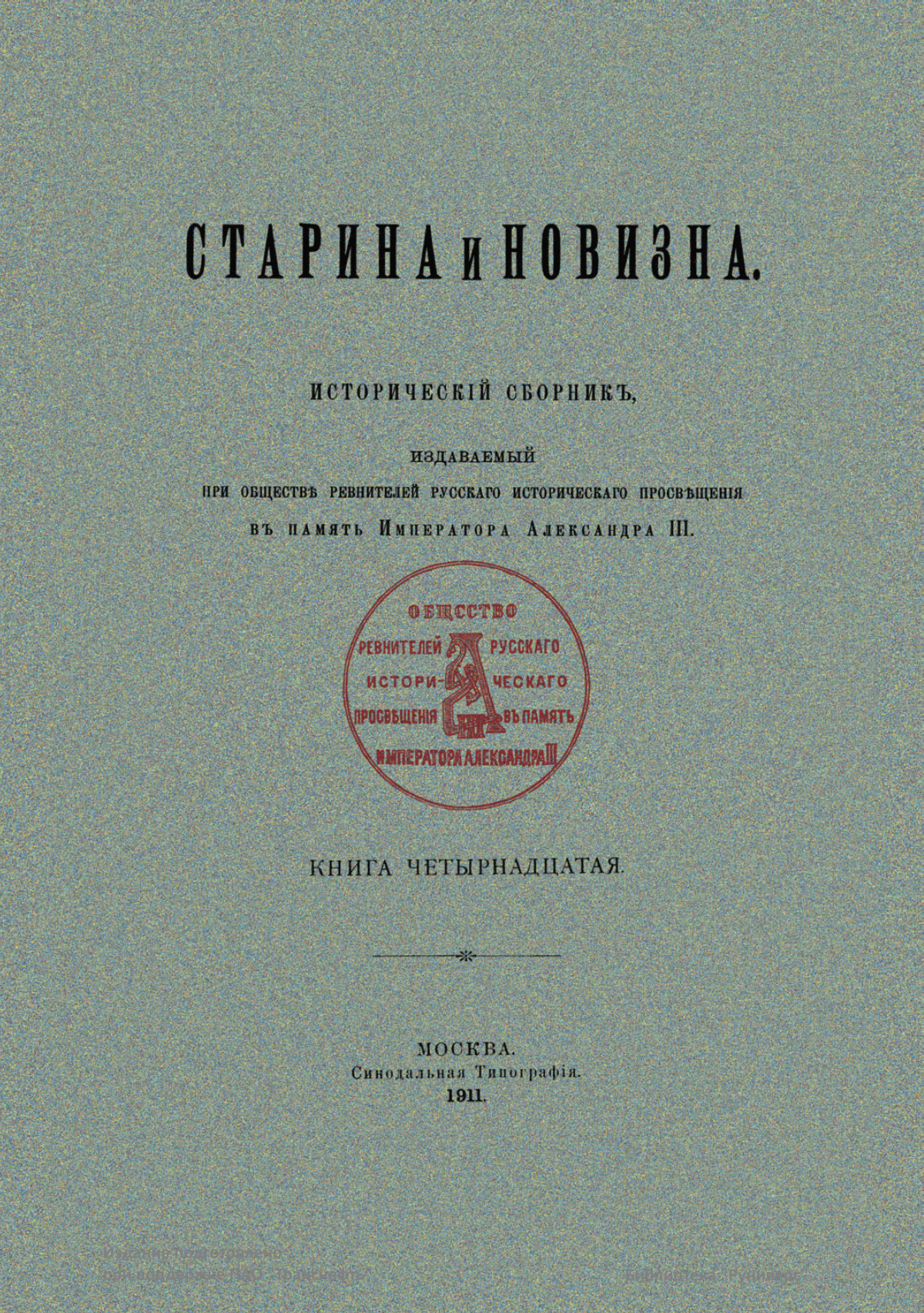 «Старина и новизна» — русский исторический сборник, издававшийся «Обществом ревнителей русского исторического просвещения в память императора Александра III». Сборник выходил в Петербурге в 1897–1904 и в Москве в 1904–1917 годах по мере накопления материала. Руководил изданием сборника граф С. Д. Шереметев (1844–1918) — историк, археолог, председатель «Общества», одного из первых объединений историков монархического направления. Члены общества способствовали изданию документов прошлого, содействуя развитию исторической науки и популяризации интереса к историческим материалам. «Старина и новизна» представляет собой собрание документальных материалов по русской истории и литературе XVII–XIX века. Вместе с Шереметевым в создании сборника участвовали блестящие историки А. П. и Н. П. Барсуковы, С. Ф. Платонов, Л. П. Майков и др.