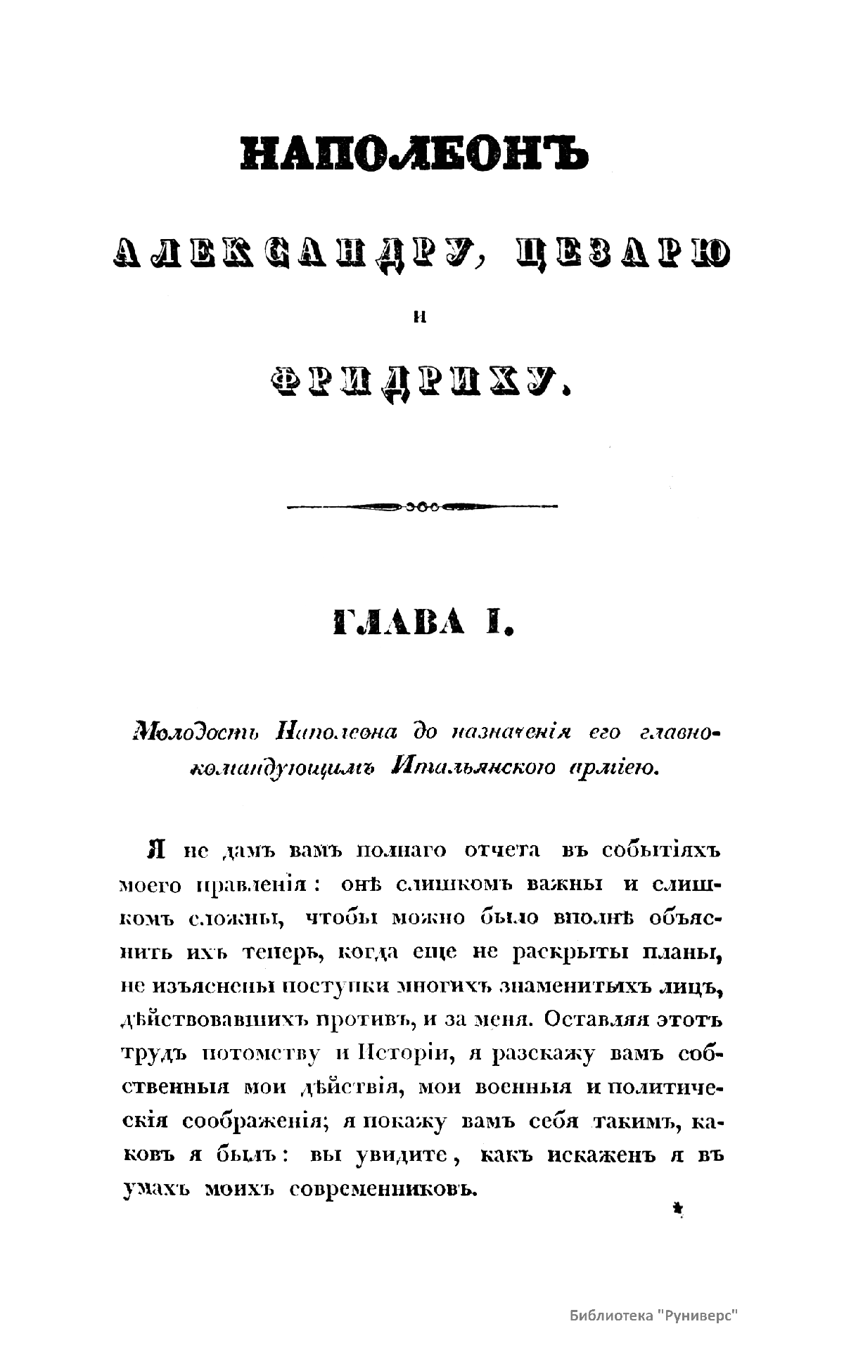 Русский перевод сочинения «Политическая и военная жизнь Наполеона» был сделан со знаменитой работы Жомини, изданной в Париже в 1827 г., — «Vie politique et militaire de Napoléon, racontée par lui-même au tribunal de César, d’Alexandre et de Frédéric» («Политическая и военная жизнь Наполеона, рассказанная им перед судом Цезаря, Александра и Фридриха»). Для данного труда Жомини избрал форму рассказа, который Наполеон ведет о своих походах. В основу этого повествования от первого лица лег, без сомнения, труд Э. О. де Лас Каза — секретаря Наполеона, записывавшего его мысли и воспоминания на острове Св. Елены, изданный в 1822–1823 гг. под названием «Mémorial de Sainte-Hélène» («Мемориал Святой Елены).