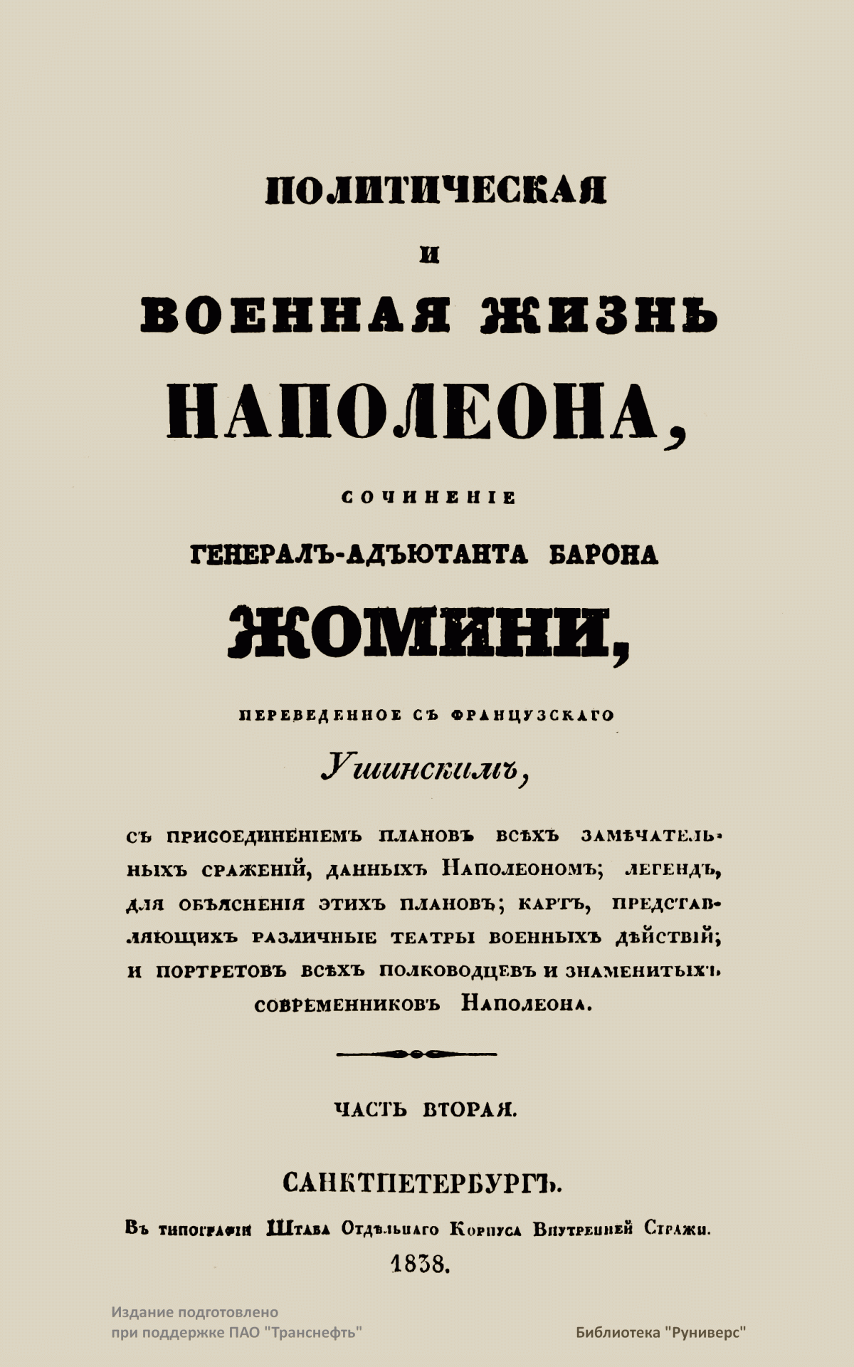 Русский перевод сочинения «Политическая и военная жизнь Наполеона» был сделан со знаменитой работы Жомини, изданной в Париже в 1827 г., — «Vie politique et militaire de Napoléon, racontée par lui-même au tribunal de César, d’Alexandre et de Frédéric» («Политическая и военная жизнь Наполеона, рассказанная им перед судом Цезаря, Александра и Фридриха»). Для данного труда Жомини избрал форму рассказа, который Наполеон ведет о своих походах. В основу этого повествования от первого лица лег, без сомнения, труд Э. О. де Лас Каза — секретаря Наполеона, записывавшего его мысли и воспоминания на острове Св. Елены, изданный в 1822–1823 гг. под названием «Mémorial de Sainte-Hélène» («Мемориал Святой Елены).