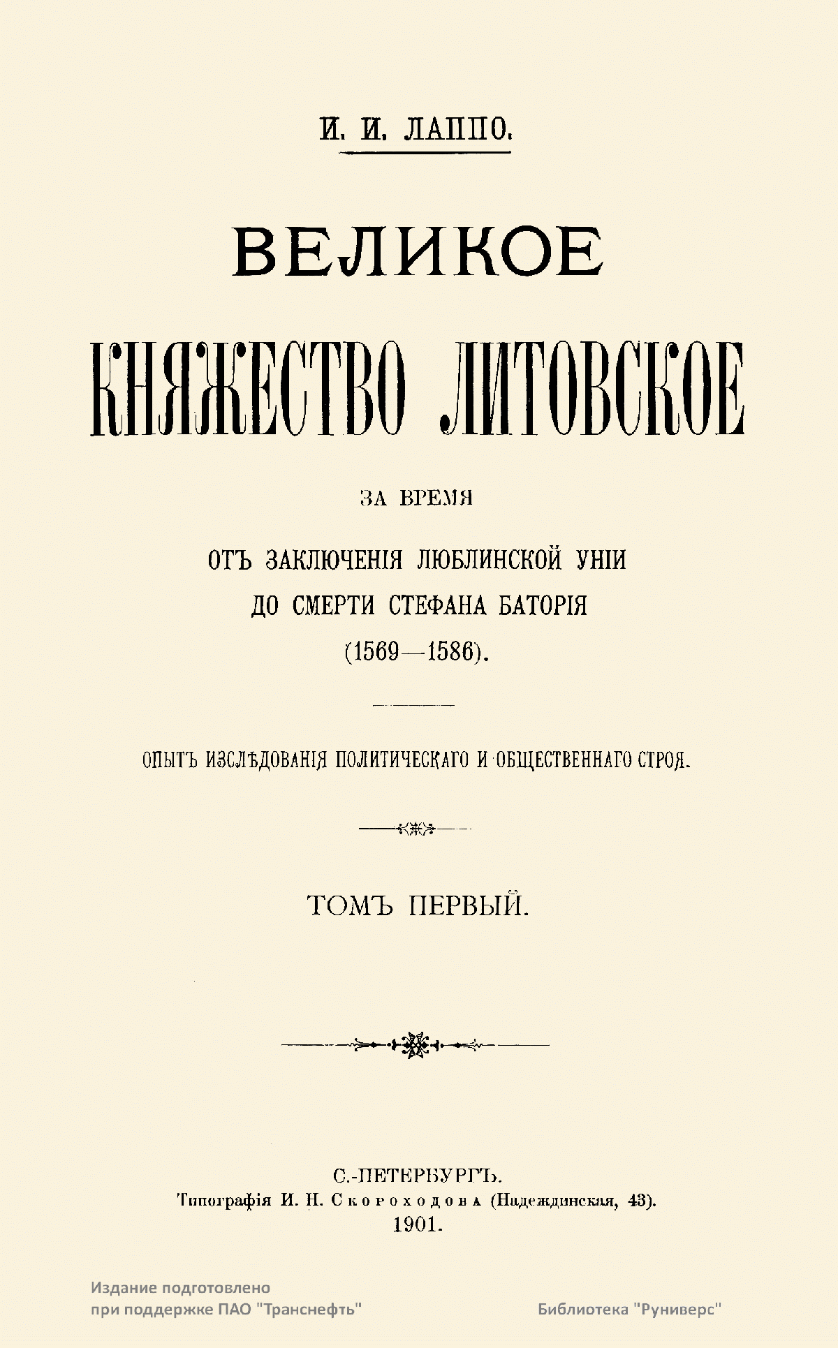 Исследование «Великое княжество Литовское за время от заключения Люблинской унии до смерти Стефана Батория» было представлено автором в качестве диссертации на соискание должности приват-доцента Петербургского университета и заслужило восторженные отзывы таких выдающихся историков, как С. Ф. Платонов и М. К. Любавский. Лаппо ввел в научный оборот множество ранее неизученных документов по периоду политического объединения Литвы и Польши (1569–1586), которому посвящена книга. Уже во время ее написания Лаппо задумал второй том, охватывающий тот же хронологический период, но в котором рассматривались бы иные вопросы, касающиеся внутреннего устройства и внешнеполитических связей великого княжества Литовского. Однако в ходе работы, которая продолжалась десять лет, научные планы автора изменились. Во второй книге, «Великое княжество Литовское во второй половине XVI столетия. Литовско-русский повет и его сеймик», Лаппо сосредоточился на изучении повета — единицы административно-территориального деления Литовско-русского государства, и системе управления, связанной с этим делением. Ряд архивных документов, обнаруженных автором во время исследования темы, включен в раздел «Приложения».
