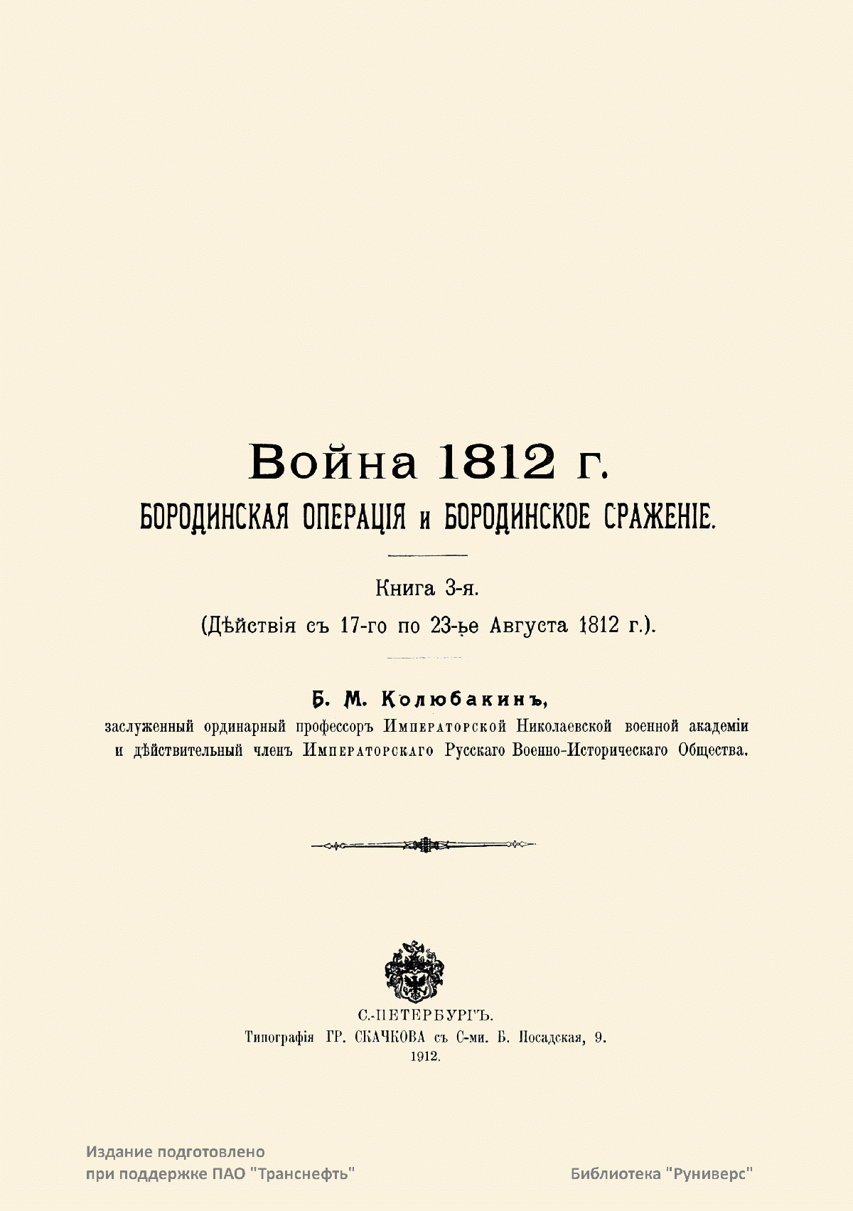 Война 1812 г. Бородинская операцiя и Бородинское сраженiе. Книга 3-я. (Дѣйствия съ 17-го по 23-ье Августа 1812 г.)