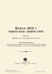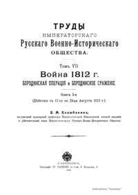 К столетнему юбилею Бородинского сражения по поручению Императорского Русское военно-исторического общества была подготовлена подневная хроника Бородинской операции с 8 по 26 августа 1812 года, составившая три тома (с V по VII тома Трудов ИРВИО). Окончание хроники за 24–26 августа осталось неопубликованным. В книге собраны и документы-первоисточники по Бородинскому сражению, как наиболее яркому событию всей военной кампании, сражению, в подготовке и проведении которого наиболее явно отразились все положительные и отрицательные стороны военной системы. Документы расположены по дням, объединены в серии, каждой серии предшествует объяснительный текст.