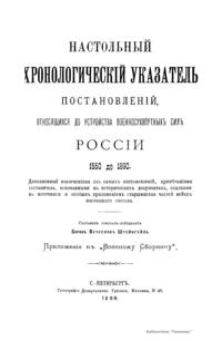 Настольный хронологическiй указатель постановленiй, относящихся до устройства военносухопутныхъ силъ Россiи 1550 до 1890