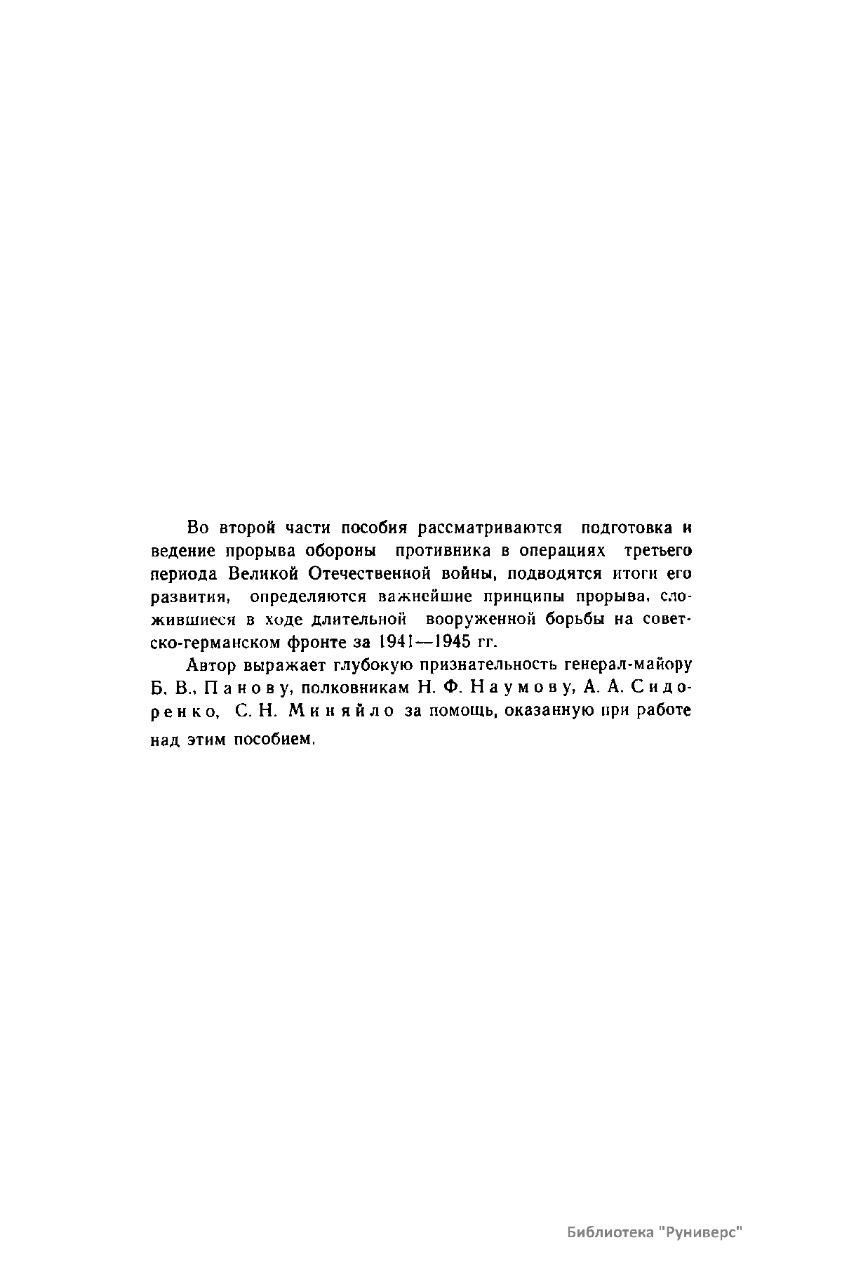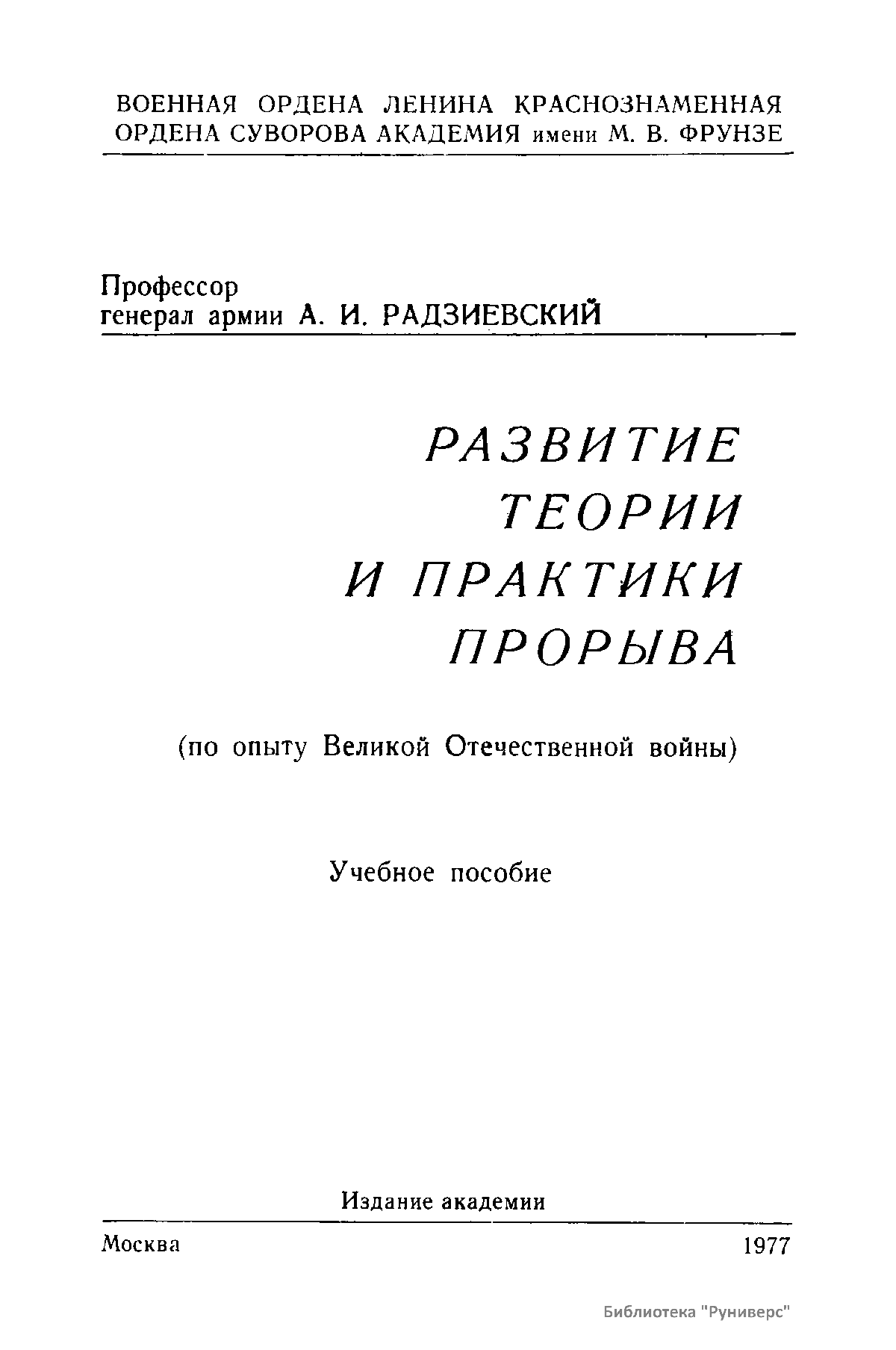 В труде анализируются факторы, определившие необходимость применения прорыва, прослеживаются пути решения этой проблемы в ходе Первой Мировой войны и в советском предвоенном искусстве в предвоенные годы; исследуется развитие форм и способов прорыва в операциях Великой Отечественной войны с учетом конкретных условий их ведения, обобщается достигнутый в этой области опыт и определяются важнейшие принципы прорыва, сложившиеся в ходе войны.