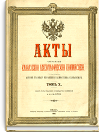 Акты Кавказской археографической комиссии — это собрание документов по истории Кавказа с X века по 1862 год, издававшееся по инициативе русских властей под редакцией выдающегося исследователя Кавказа — председателя комиссии Адольфа Петровича Берже (1828-1886). В двенадцати томах издания опубликованы ценные источники по истории народов Кавказа: арабская хроника, фирманы, гуджары (жалованные грамоты) и другие акты, главным образом XIV — первой половины XIX века на грузинском, армянском, русском, арабском, персидском, татарском, турецком языках с русским переводом, а также родословные местных ханов и султанов. Каждый том включает документы за время правления того или иного Кавказского Наместника.