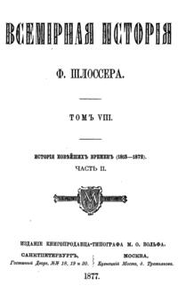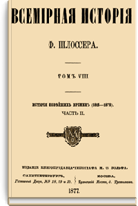«Всемирная история» — знаменитый фундаментальный труд немецкого ученого Фридриха Кристофа Шлоссера представляет собой синтез его специальных исследований и университетских курсов. Описываемый период доведен до 1815 года.