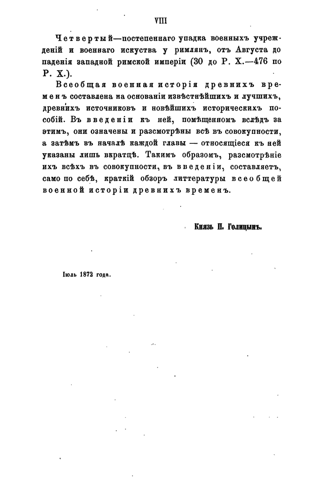 Впервые издана в Петербурге в 1872-1878 гг. Свой капитальный труд «Всеобщая военная история» в 15 томах князь Николай Сергеевич Голицын создал в 1838-47 годах в период профессорско-преподавательской работы в Императорской военной академии, где он руководил кафедрой стратегии и затем — военной истории. На протяжении двадцати лет со времени учреждения академии не существовало учебного пособия на русском языке по военной истории. Голицын, с разрешения академического и высшего начальства, делает первый шаг к восполнению недостатка в военной литературе. Работа Голицына явилась первой в России и Европе попыткой полного систематического изложения всеобщей военной истории и задумывалась автором как руководство к преподаванию и изучению этого предмета.