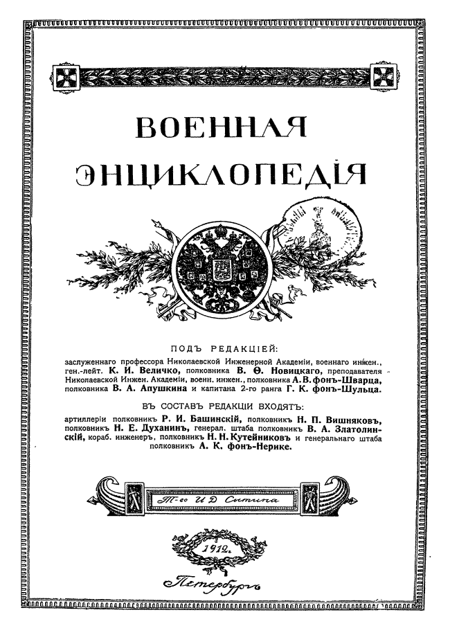 Благодаря издателю Ивану Дмитриевичу Сытину (1851-1934) энциклопедия по изяществу издания превосходила все подобные европейские издания того времени. В работе над энциклопедией принимали участие многие ведущие военные специалисты России, среди них особо выделяются генерал-майор А. Н. Апухтин, генерал-лейтенант М. М. Бородкин, генерал-майор И. И. Защук, капитан 2-го ранга П. И. Белавенец, полковник Н. М. Затворницкий, полковник П. Н. Краснов, генерал-лейтенанты А. П. Михневич, полковник А. Е. Снесарев, капитан В. К. Судравский и многие другие.