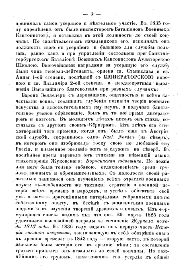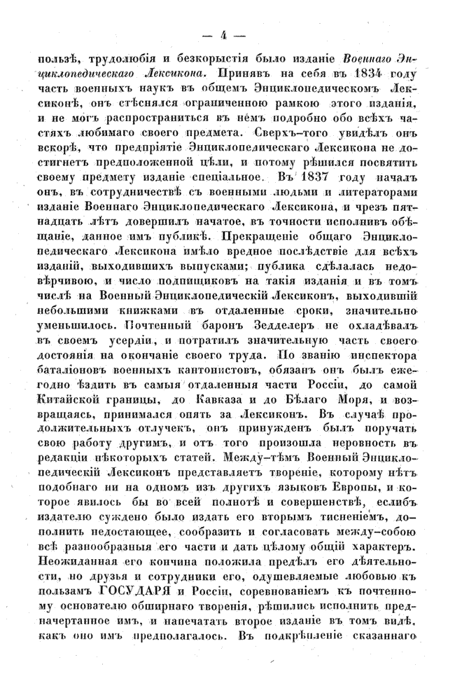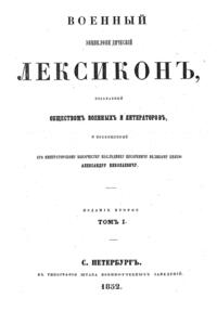 Военный энциклопедический лексикон впервые издавался с 1837 по 1850 год и насчитывает 14 основных томов и один дополнительный (вышел в 1852 г.). Этот огромный труд обязан своим появлением почти исключительно энергии и настойчивости его редактора барона Л. И. Зедделера, на котором лежала вся основная масса работы. По сути своей «Лексикон» являлся первой русской военной энциклопедией (до него выходил только двухтомный «Военный словарь» С. А. Тучкова, в 1818 г.). Несмотря на довольно холодный приём военными кругами первых выпусков «Лексикона», выходившего небольшими книжками (известно, что первая часть состояла из четырёх отдельных книжек) через значительные промежутки времени и стоившего в продаже весьма немалых денег, Зедделер настойчиво занимался его изданием, вложив, помимо личного труда, и значительную часть своего состояния, и в течение 13 лет привёл его к окончанию. Программа «Лексикона» была намечена чрезвычайно широко, имея в виду крайне низкий образовательный уровень армейского офицерства времён императора Николая I и трудность пополнения общего образования при глухих стоянках и постоянном передвижении полков с места на место. В силу этого в «Лексикон» включён ряд сведений, весьма отдалённо связанных с военным делом. Барону Зедделеру удалось привлечь к составлению «Лексикона» наиболее выдающихся военных и учёных Николаевского времени, среди которых особо выделяются К. Ф. Багговут, М. И. Богданович, К. М. Базили, А. В. Висковатов, Н. С. Голицын, А. Н. Греч, Д. А. Милютин, А. И. Михайловский-Данилевский, П. И. Рикорд и другие. Из отделов «Лексикона» наиболее полным и наиболее тщательно составленным является военно-исторический отдел; слабее всего выглядит отдел военной техники, что вполне соответствует тогдашнему её состоянию. «Лексикон» построен по алфавиту статей; к некоторым томам сделано особое «Прибавление», включающее в себя некоторые статьи, пропущенные по разным причинам в предыдущих томах. В связи с долгим изданием «Лексикона» и достаточно быстрым устареванием имеющихся в нём сведений, в 1852 г. был выпущен дополнительный том под названием «Прибавление к Военному энциклопедическому лексикону».