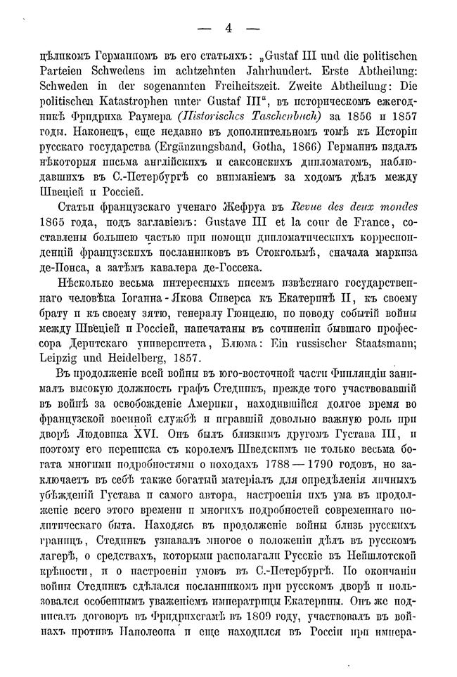 Швеция в продолжение всего XVII столетия была преобладающим государством на Балтике. В эпоху Карла XII и Петра I это положение изменилось в пользу России: вместе с двумя прибалтийскими провинциями была присоединена юго-восточная часть Финляндии. При Елизавете Финляндия была присоединена до реки Кюмени. Во время русско-шведской войны 1788 – 1790 годов при Густаве III шведы попытались вернуть уступленные части Финляндии. Но эта война не изменила границы. Во время своей работы над книгой автор пользовался и русскими, и шведскими историческими материалами.