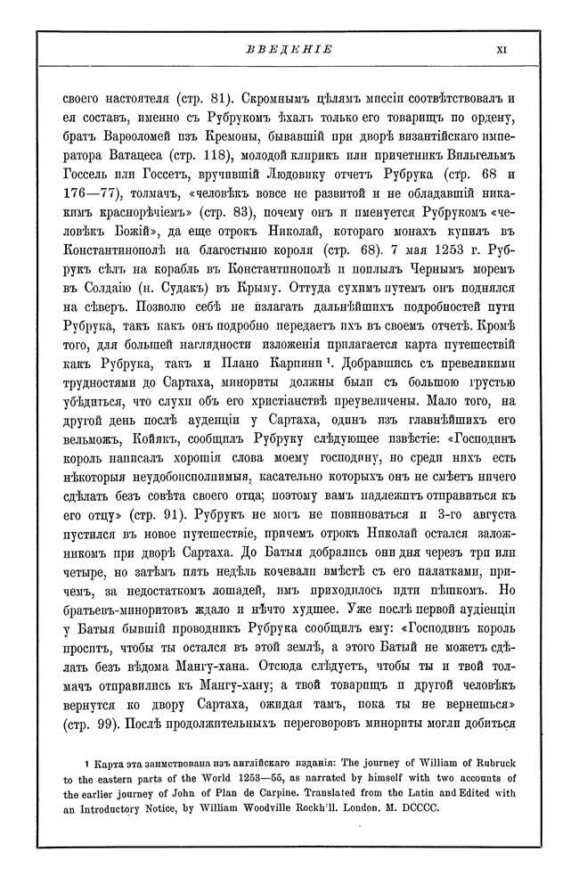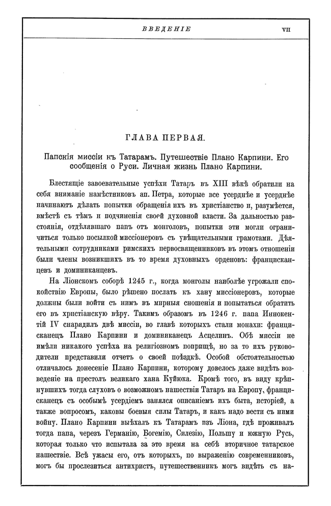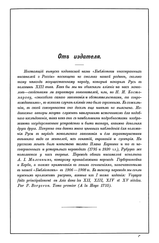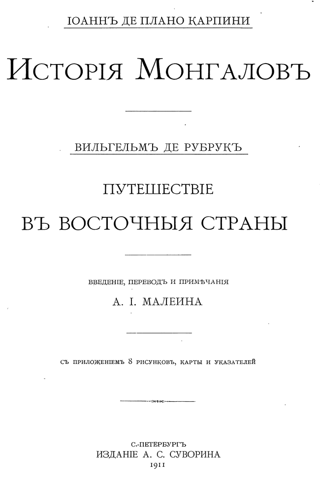 Выпуск «Библиотеки иностранных писателей о России» Издательства А. С. Суворина, посвященный покорившим в XIII веке Русь монголам. Издаваемые авторы могут служить наилучшим источником для исследования этого некогда могущественного народа, так как они с наибольшими подробностями изображают государственное устройство и быт татар, взаимно дополняя друг друга. Попутно они представляют множество ценных наблюдений для положения Руси в период монгольского завоевания и для характеристики внешнего вида ее жителей, их занятий, верований и суеверия.