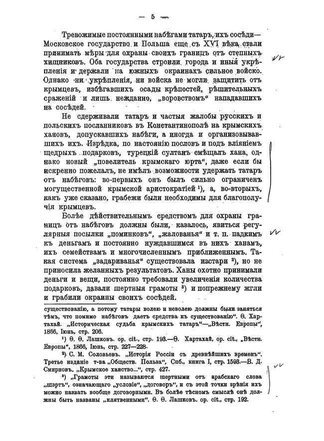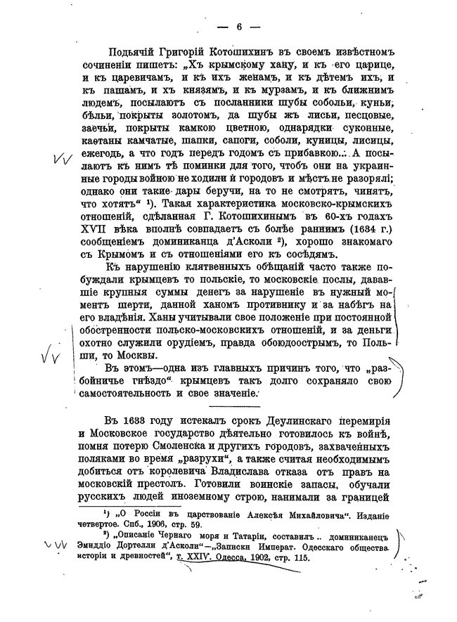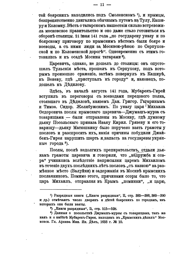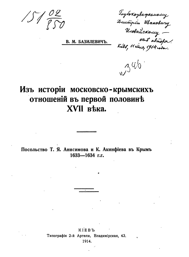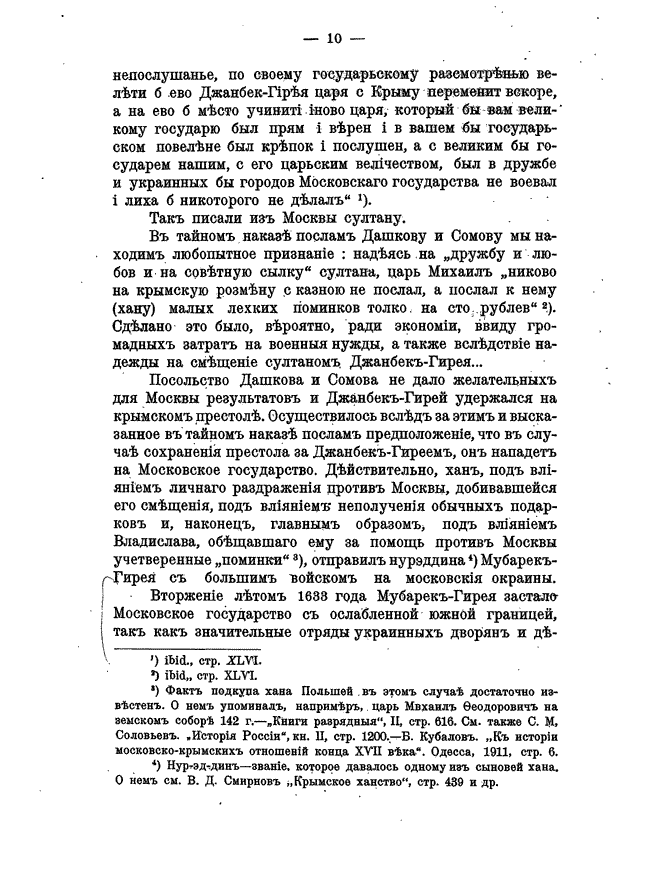 Главным средством к существованию крымских татар всегда являлась разбойничья добыча. Татары постоянно грабили своих соседей – Московское государство и Польшу. «Разбойничье гнездо» крымцев долго сохраняло свою самостоятельность и своё значение, так как при постоянной обостренности польско-московских отношений крымские ханы за деньги охотно служили орудием то Польши, то Москвы. Автор рассматривает историю московско-крымских отношений первой половины XVII века и подробно останавливается на посольстве Тимофея Анисимова и Калистрата Акинфиева во время Русско-польской (Смоленской) войны (1632 – 1634), когда с ханом Джанбек Гиреем был заключен договор, по которому восстанавливался мир с Крымом и была обещана помощь против польского короля Владислава.