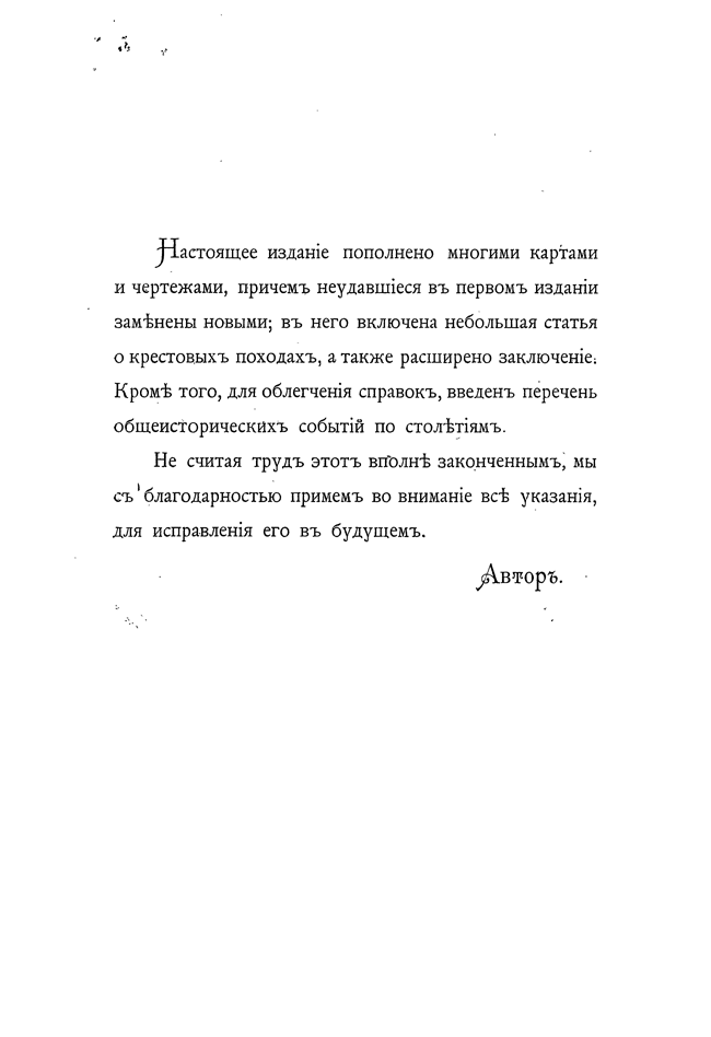 Стараясь выполнить эту программу, а также желая возможно нагляднее показать зависимость состояния военного искусства данной эпохи от современного состояния культуры и цивилизации, главные отделы настоящего сочинения сопровождаются общеисторическими данными, сгруппированными по столетиям. В приведенных перечнях событий указаны только важнейшие научные и практические изобретения, течения в области философии, науки и искусства.
