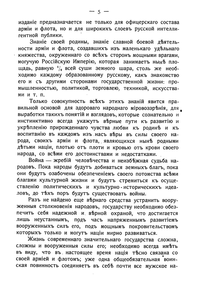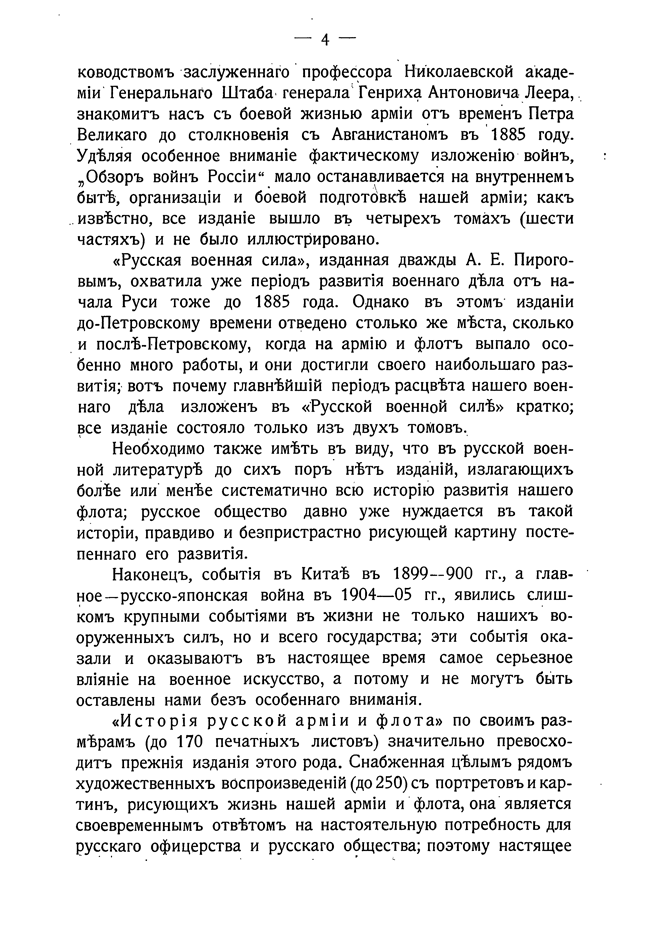 «История» рисует картину постепенного развития русского военного дела. С особым вниманием издание останавливается на наиболее выдающихся боевых эпизодах, интересуясь в тоже время организацией, бытом, вооружением и боевой подготовкой наших войск, в связи с политической жизнью государства. «История русской армии и флота» по своим размерам ( до 170 печатных листов) значительно превосходит прежние издания этого рода. Снабженная большим количеством иллюстраций и фотографий, она предназначалась для просвещения и русского офицерства, и русского общества.