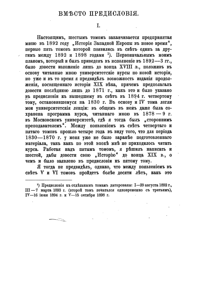 Первые тома вышли в начале девяностых годов 19 века и, посвященные- один «переходу от средних веков к новому времени», другой — «реформации и политической жизни в XVI и XVII вв.», третий — «XVIII веку и революции», — возникли из читанных им общих курсов новой истории, имевших своей целью выяснить значение двух главных переворотов в жизни европейского Запада за последние четыре века, т.е., реформации и революции — в связи с общим характером новой истории с её отличием от средневековой. Однако, позднее, Кареев решился раздвинуть границы первых задач и довести повествание до современнго ему положения дел.