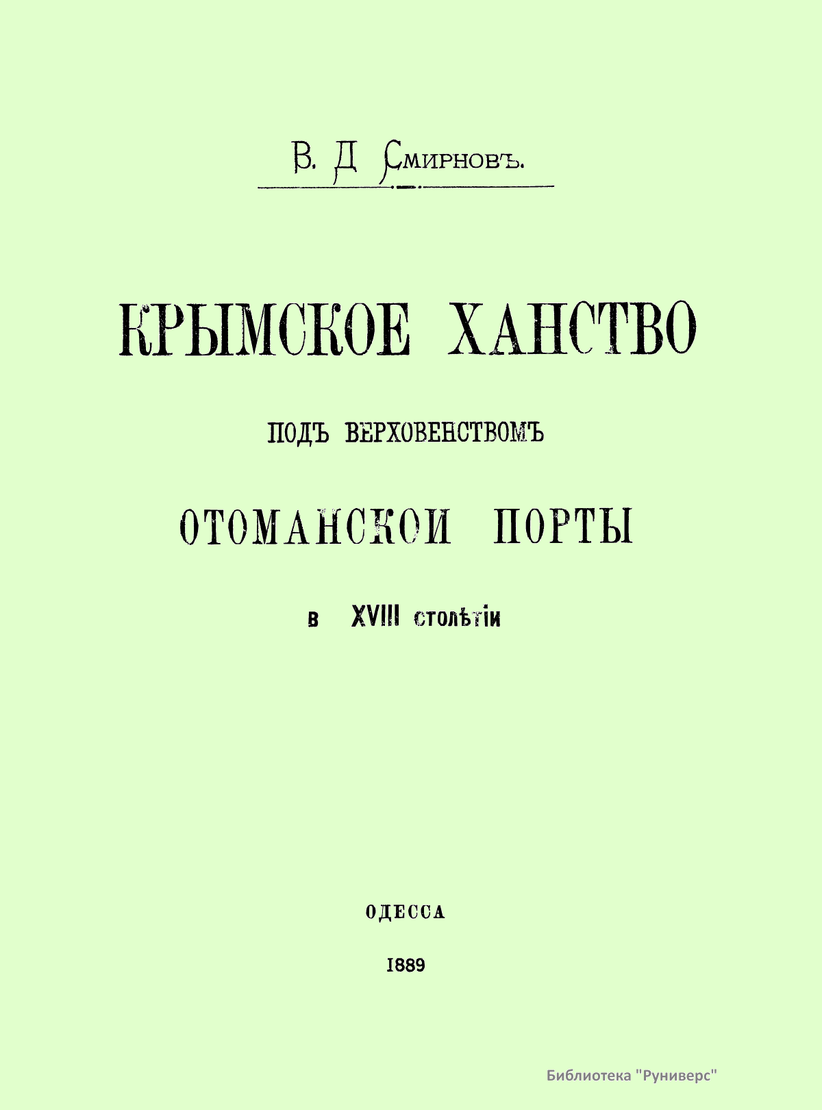 Монографии профессора Петербургского университета В. Д. Смирнова по истории Крымского ханства, впервые вышедшие в свет в 1887 и 1889 гг., - подробное исследование этого государственного образования. Были написаны главным образом по материалам турецких и крымско-татарских источников.