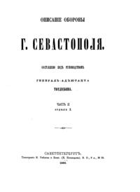 Полный обзор средств воюющих держав, полуострова Крыма, в особенности театра военных действий, изложенный по дням ход обороны и атаки, действия противников, а также распоряжения относительно убыли и усиления крымской армии, продовольствия войск и попечения больных и раненных, планы и чертежи.