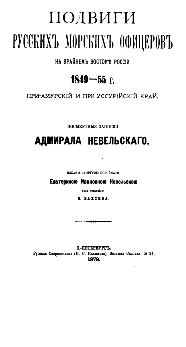 Записки адмирала свидетельствуют, что инициатива решения амурского вопроса всецело принадлежала автору. «Ни женитьба, ни печальная обстановка молодой жены, ни голодная смерть первой дочери его — ничто, ничто не помешало ему довести до конца раз начатое дело», — рассказывает редактор В. Вахтин.
