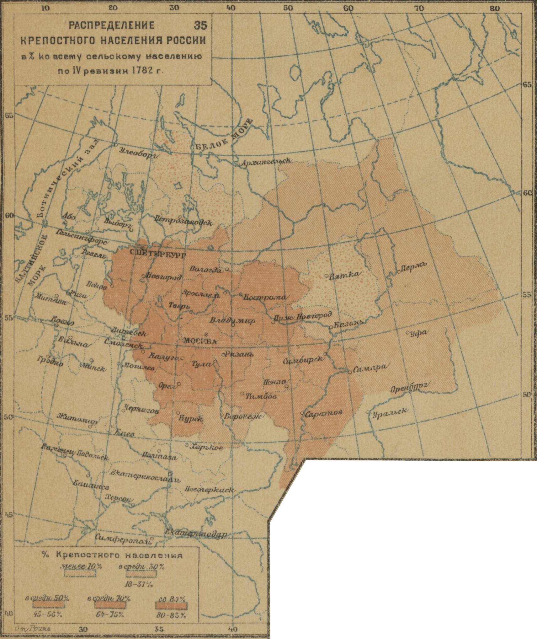 Распределение крепостного населения России в % ко всему сельскому населению по IV ревизии 1782 года