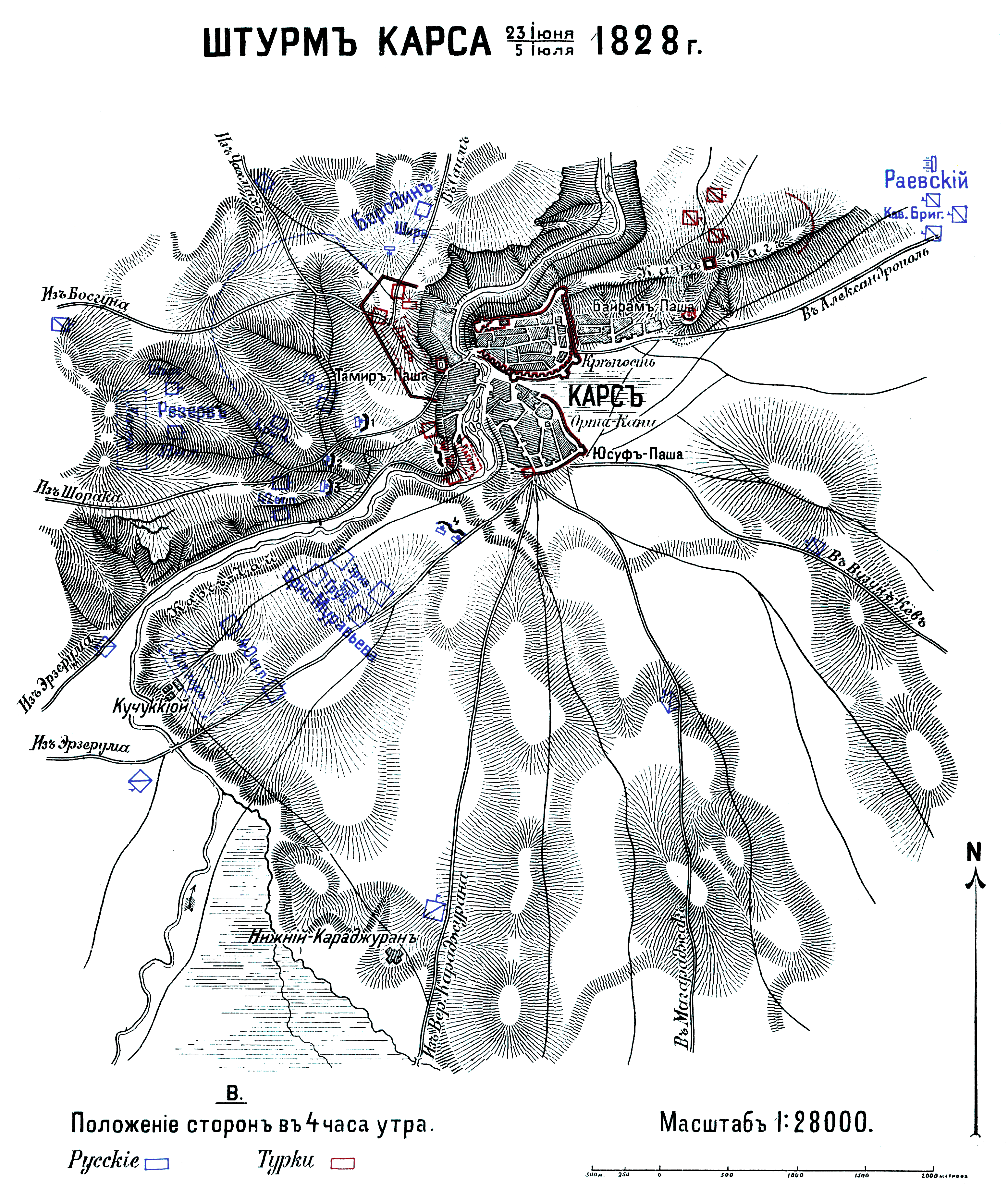 Штурм Карса 23 июня/5 июля 1828 года. B. Положение сторон в 4 часа утра