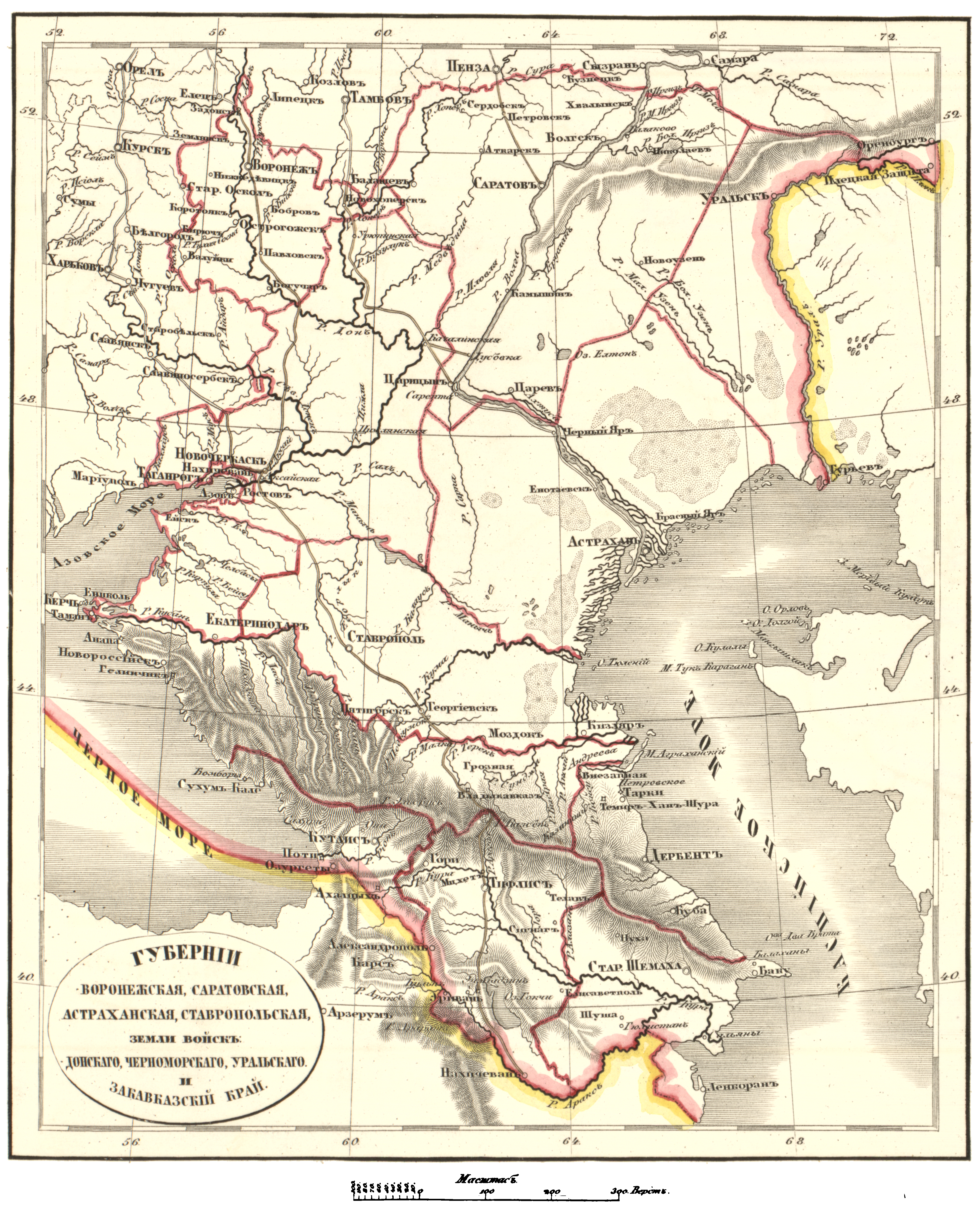 Губернии Воронежская, Саратовская, Астраханская, Ставропольская. Земли войск: Донского, Черноморского, Уральского. Закавказский край