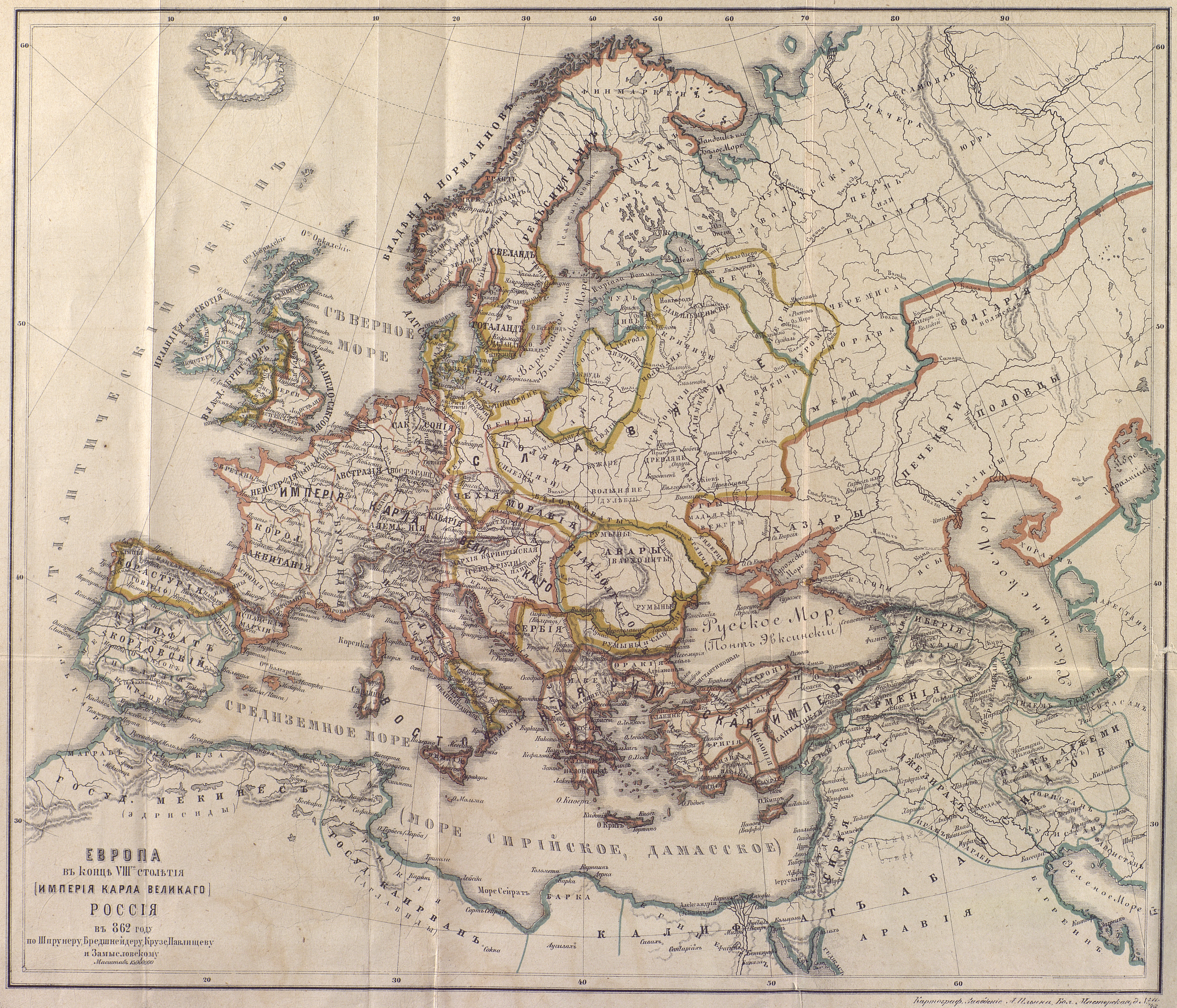 Европа в конце VIII столетия (империя Карла Великого). Россия в 862 году. По Шпрунеру Брейдшнейдеру Крузе, Павлищеву и Замысловскому