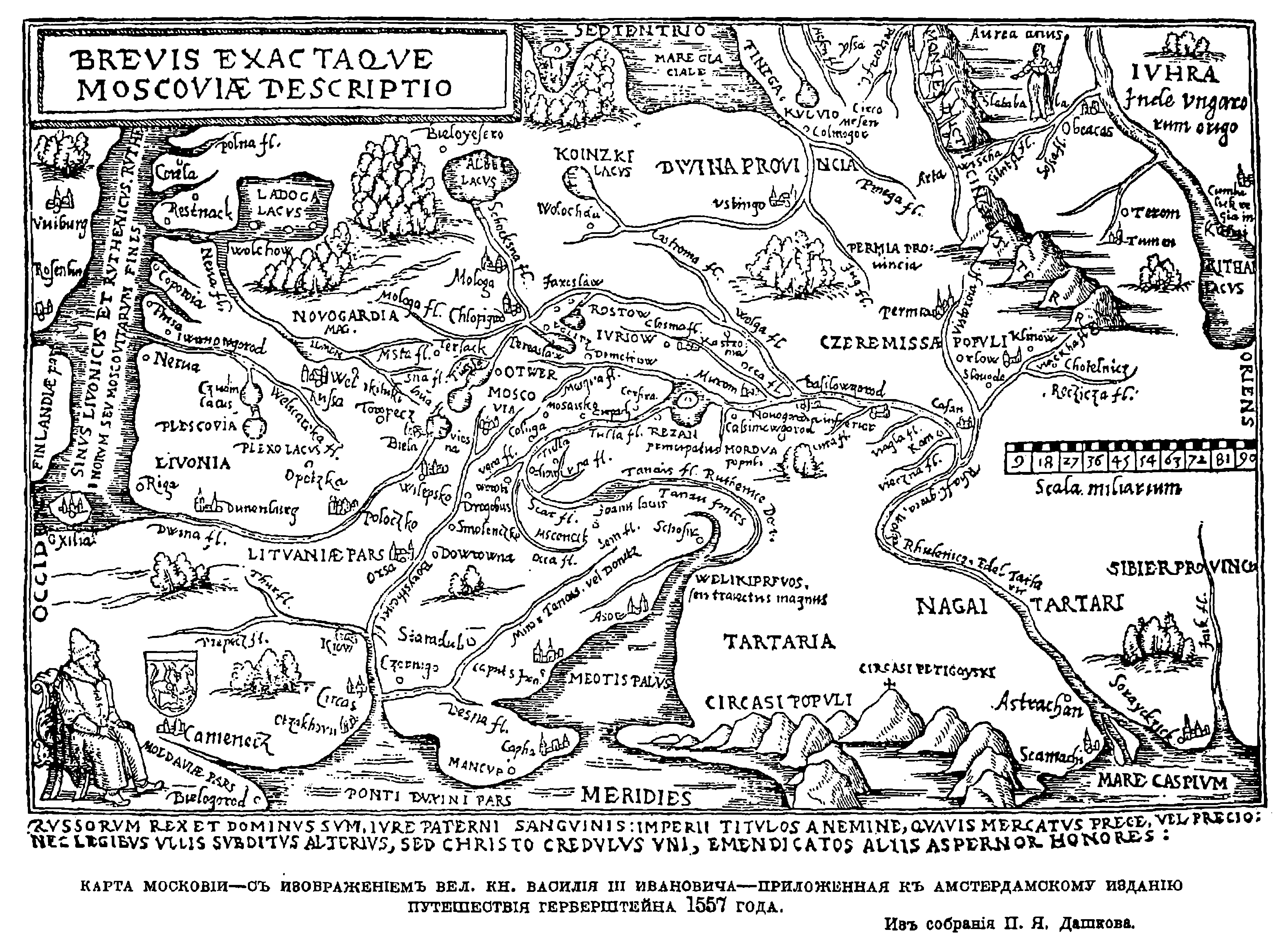 Московия - с изображением Великого Князя Василия III Ивановича - карта приложена к амстердамскому изданию путешествия Герберштейна 1557 года