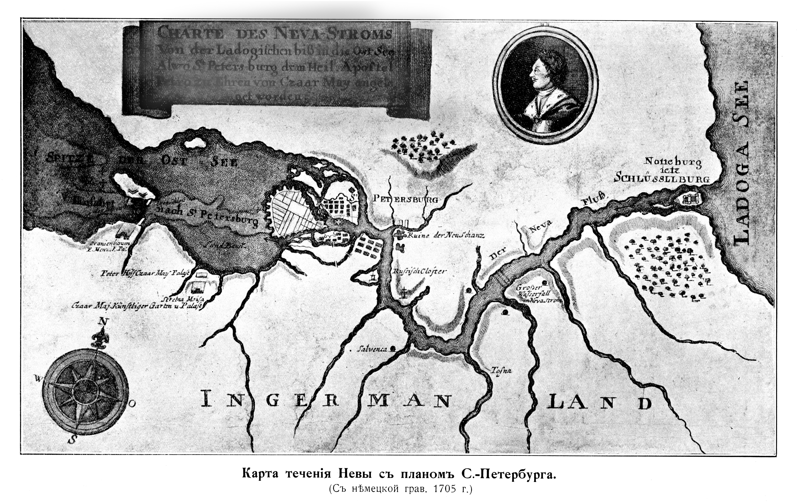 Течение Невы с планом Санкт-Петербурга (с немецкой гравюры 1705 года)