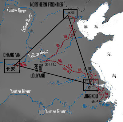Отмечены такие ключевые места, как Чанъань (长安) и Лоуян (洛阳) вдоль реки Хуанхэ, а также Цзинкоу вдоль реки Янцзы
