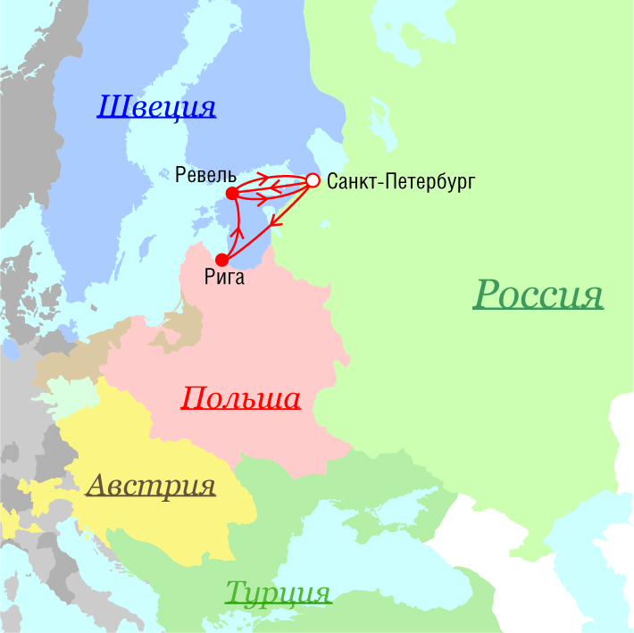 На карте указаны маршруты путешествий Петра I на каждый год. Расстояния приблизительно вычислены по российским дорожникам XVIII и XIX вв. Различия в длине маршрутов Петра и современного пути объясняются другой сеткой дорог. Длина маршрутов, на которые данные дорожников отсутствуют, была определена по электронным картам.